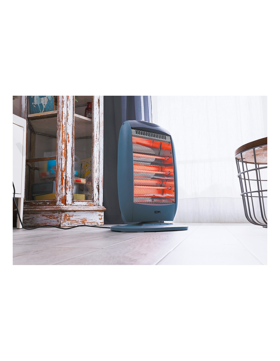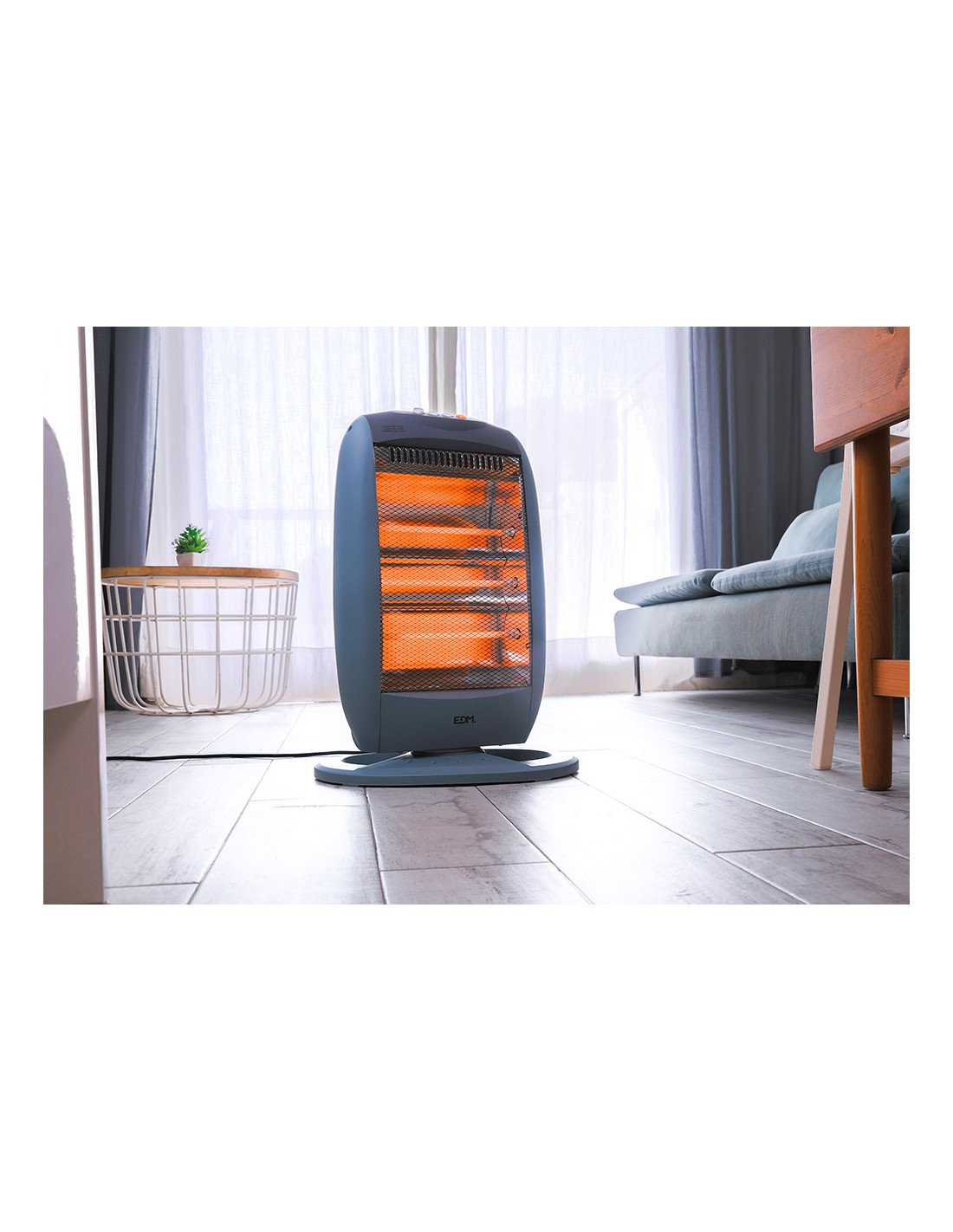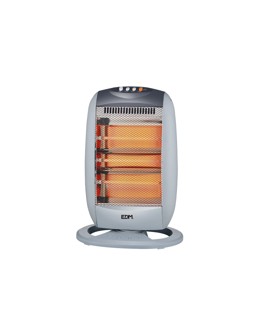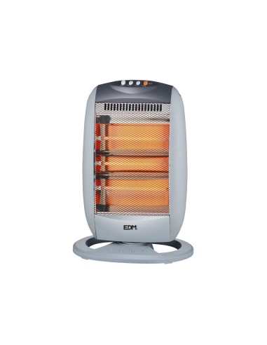 Estufa de cuarzo oscilante con sistema de seguridad anti-vuelco. tiene 3 barras de cuarzo con emision instantanea de calor. 3 niveles de potencia: 400 / 800 / 1200 w, 220-240 v - 50 hz. incluye reflector protegido, base antideslizante. rejilla de seguridad y protector de sobrecalentamiento. dimensiones: 30 x 40 x 53 cm