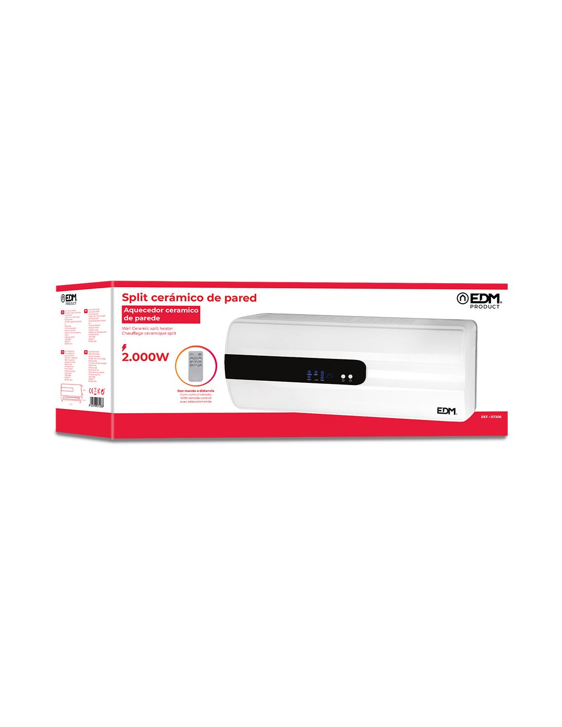 Calefactor split cerámico con mando distáncia. 220 - 240 v. potencia: 1000 - 2000 w, 2 posiciones de ajuste de calor. posicion de aire fresco. protección contra el sobrecalentamiento. dimensiones: 57 x 14 x 22 cm