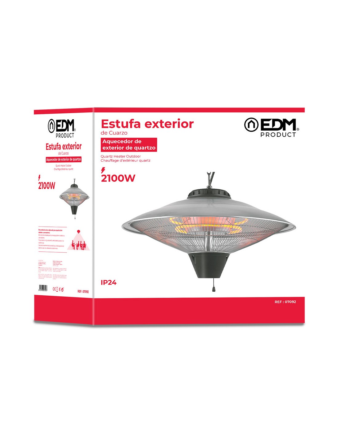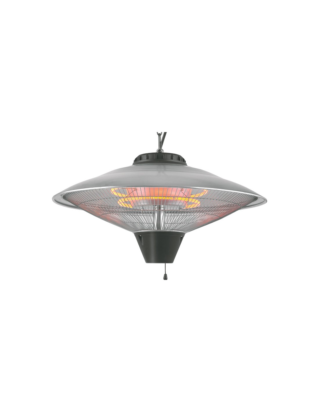 Estufa de cuarzo de exterior para techo 3 niveles de potencia: 900 / 1200 / 2100 w, 220 - 240 v,50 hz. protector de sobrecalentamiento. indice de proteccion ip24. rejilla de seguridad. apertura de 365° y orientable de 0 a 45°. hasta 3 m de alcance. interruptor y selector de potencias por tirador. dimensiones: ø56,5 x 30 cm
