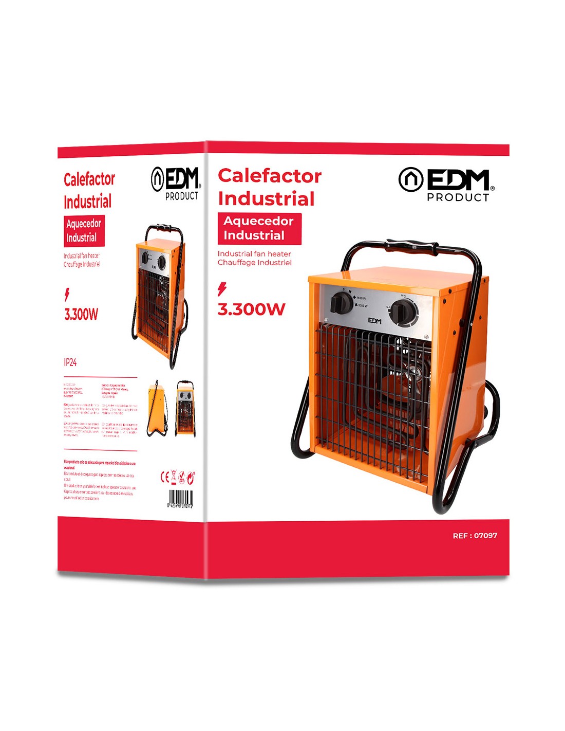 Calefactor industrial con potencia: 1650 / 3300 w, 220 - 240 v,50 hz. termostato regulable. gran estabilidad y resistencia. dispone de posición de aire fresco. incluye asa de transporte. emision instantanea de calor. protector de sobrecalentamiento. dimensiones: 33,3 x 32,5 x 48 cm
