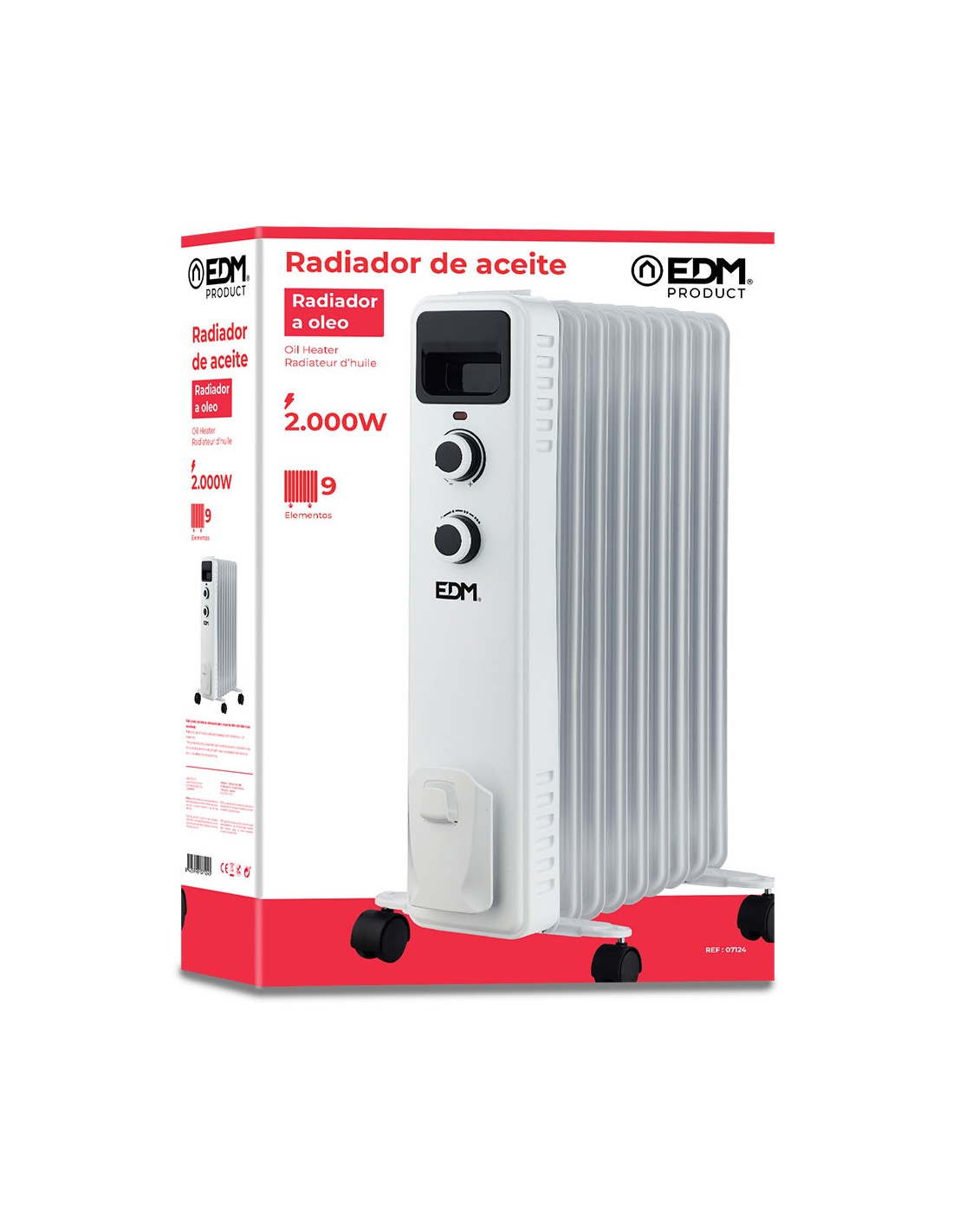 Radiador de aceite 2000 w con 9 elementos altura 60 cm. termostato ajustable 3 potencias. dimensiones: 25 x 41 x 60 cm. se recomienda por el buen uso y mantenimiento, poner siempre de pie este radiador