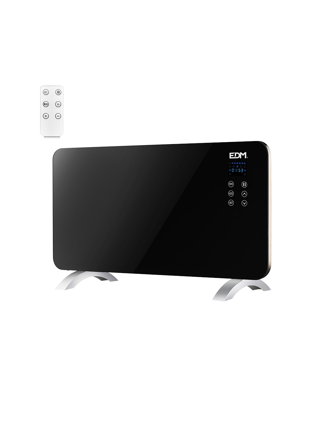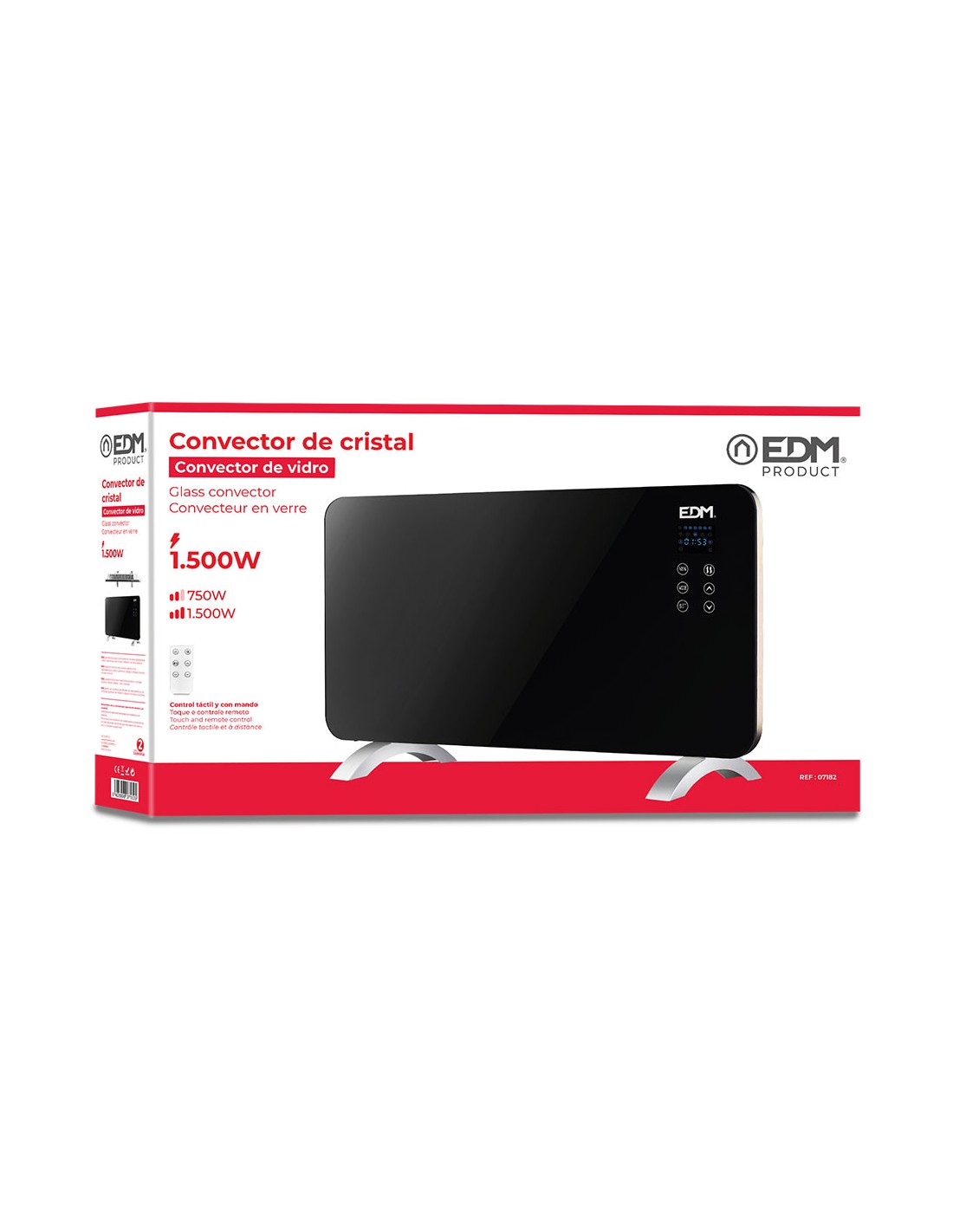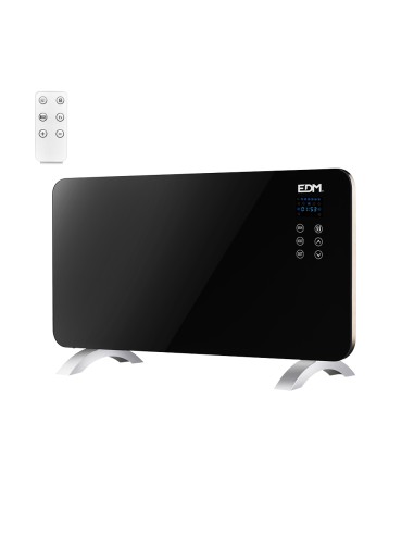 Convector con placa de cristal 1500 w, 2 niveles de potencia 750 w / 1500 w, pantalla de led, ip24, con programador 24 h y semanal, proteccion sobrecalentamiento, termostato, incluye patas, mando a distancia y sistema para colgar en la pared, medidas: 76 x 24 x 43 cm
