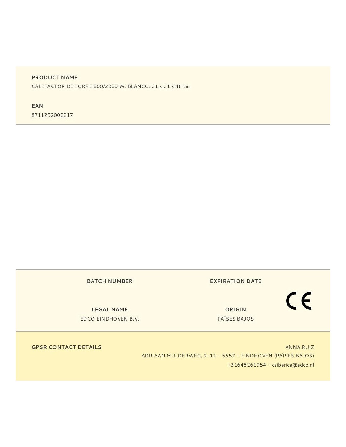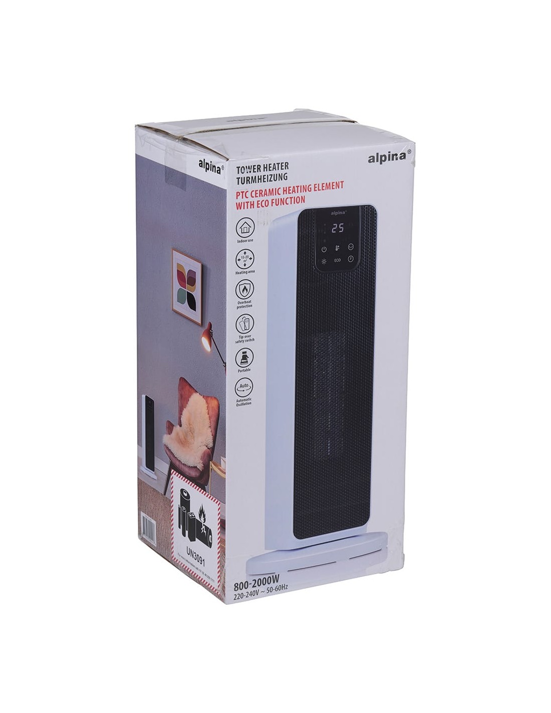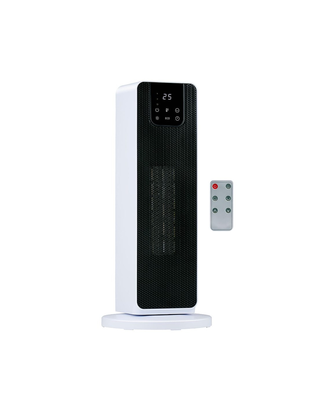 Calefactor de torre función eco 2 potencias de calentamiento: 800/2000 w 220-240~50 hz para uso interior superficie de calefacción 15-20 m, elementos calefactores cerámicos ptc, protección contra sobrecalentamiento interruptor de seguridad antivuelco función de oscilación automática función de temporizador cable de 1,5 m. incluye mando a distancia (pila cr2025 incluida). color blanco. dimensiones: 21 x 21 x 46 cm