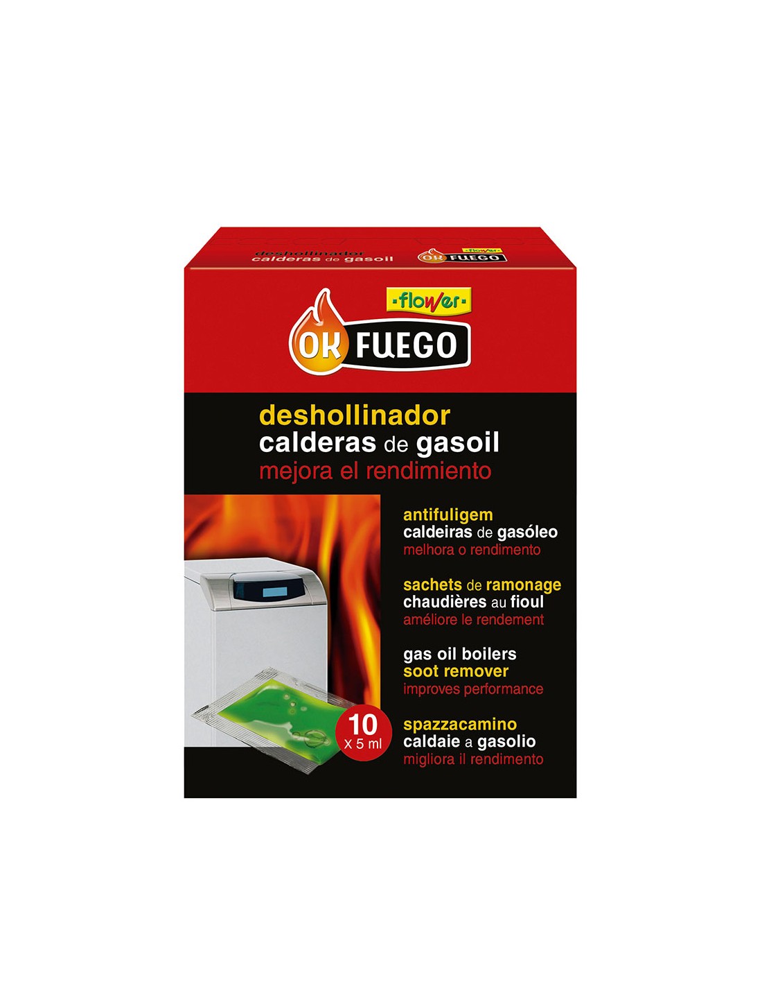 Deshollinador líquido para estufas de gasoil previene y elimina la acumulación de hollín y sustancias sin quemar que se acumulan en las paredes de los conductos y tubos de salida de humos en las calderas de gasoil. basta con echar los sobres en el quemador. contiene 10 sobres de 5 ml