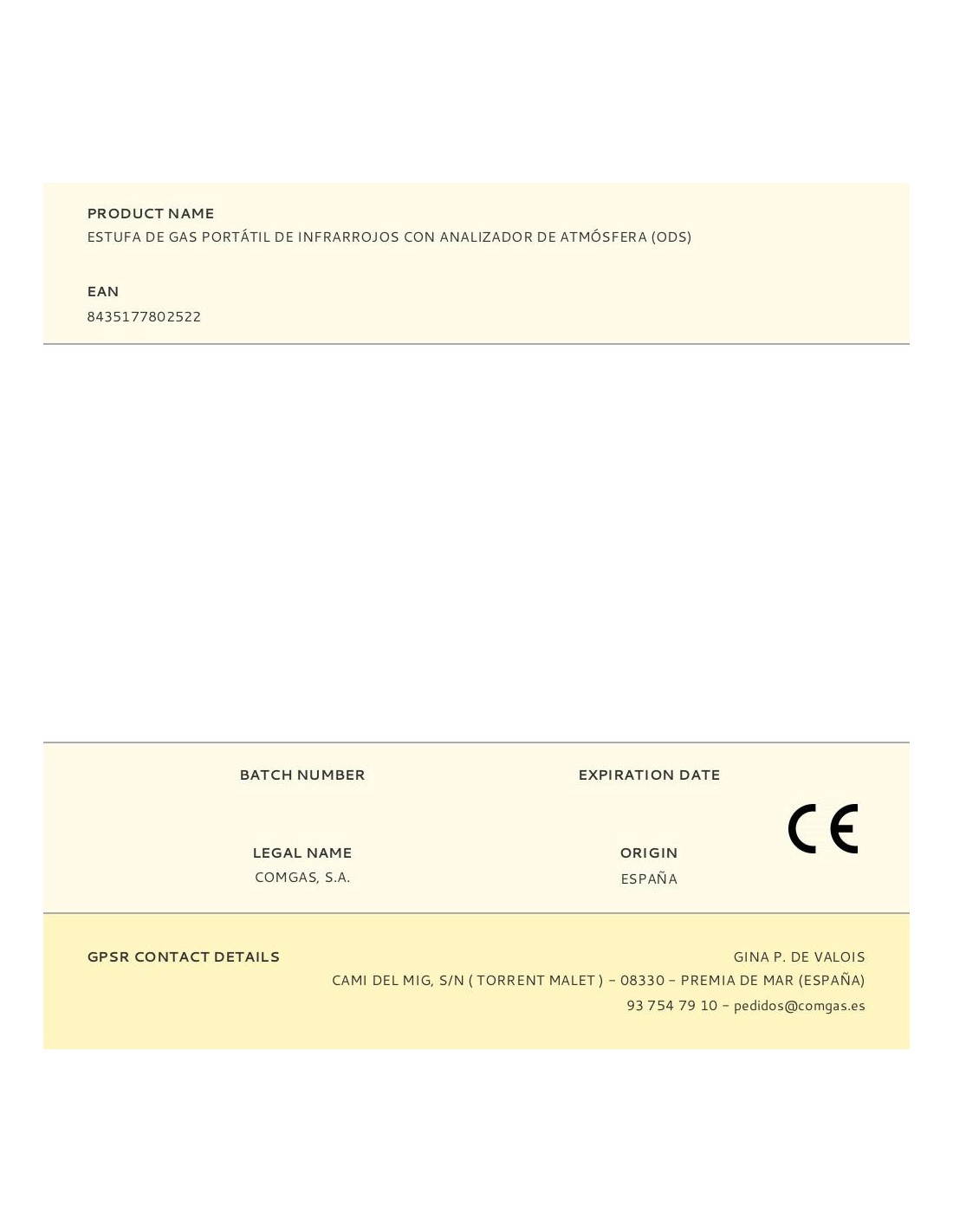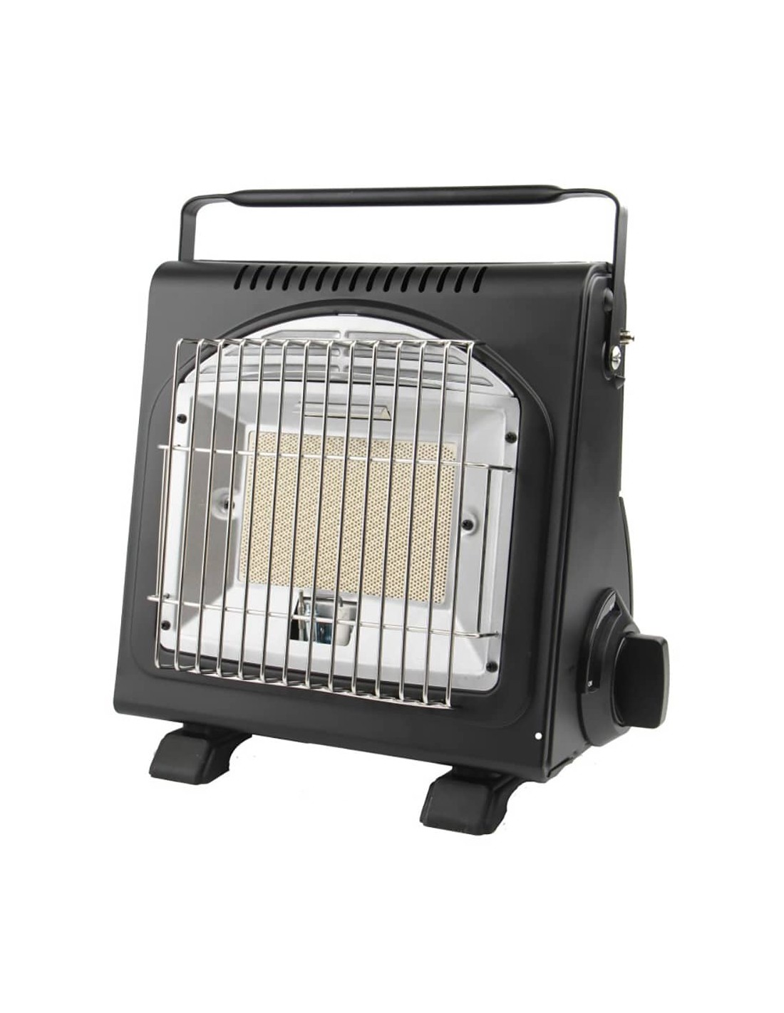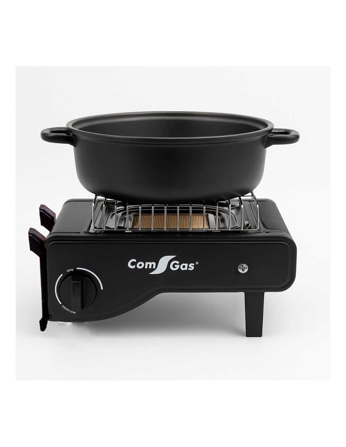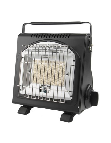 Estufa de gas portátil de infrarrojos con analizador de atmósfera (ods), 1,72 kw, consumo: 124 g/h. encendido electrónico. funciona con cartuchos, referencias: 73900, 90900, 90903. doble uso estufa o cocina. ideal para càmping. está diseñado para cerrar el suministro de gas a la estufa si el contenido de oxígeno en la habitación cae por debajo del 18% desde un 21% normal o más. ante la escasez de oxígeno, interviene apagando el piloto del termopar, que a su vez cierra el paso del gas a los quemadores, con lo que se apaga la estufa, cesando el peligro de combustión incompleta. uso exterior. medidas: 275 x 275 x 180 cm