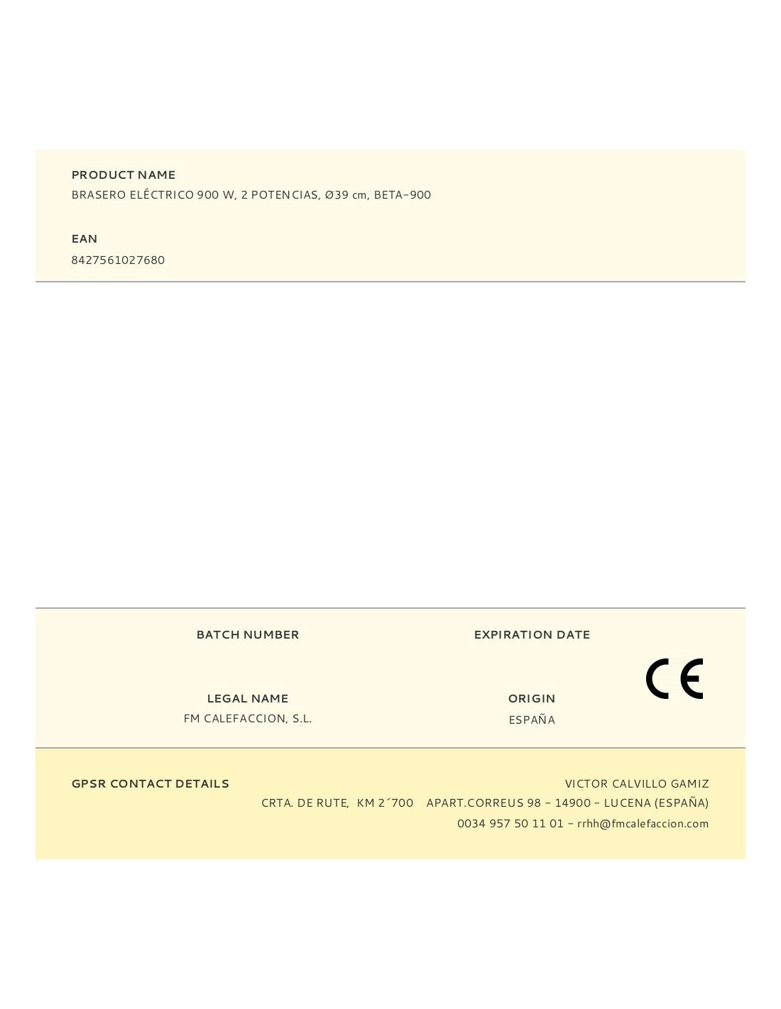 Brasero eléctrico beta-900, 2 potencias 450 w / 900 w, 230 v ~50 hz, resistencia cerámica, sistema de seguridad anti vuelco, piloto luminoso, ø39 cm