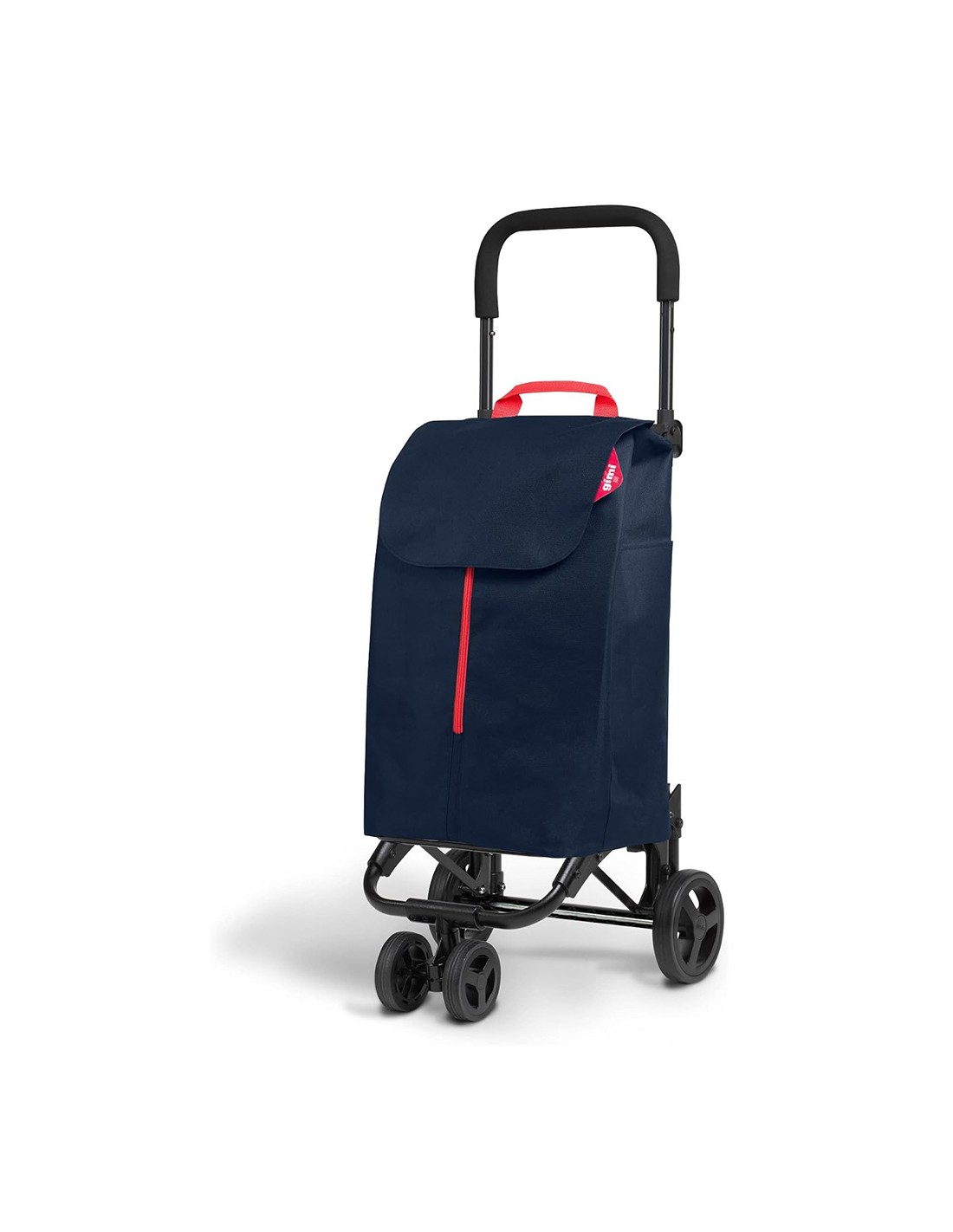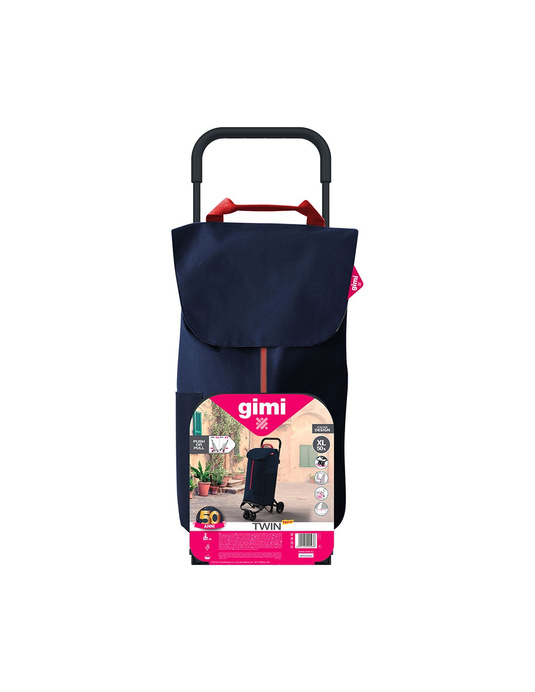 Carrito de la compra twin azul 50l 30kg doble uso: para empujar con 4 ruedas y para tirar de el con dos. bolsa de grosor aumentado y 2 bolsillos con cremallera 41x53x92cm (ancho/fondo/alto) 154319 gimi