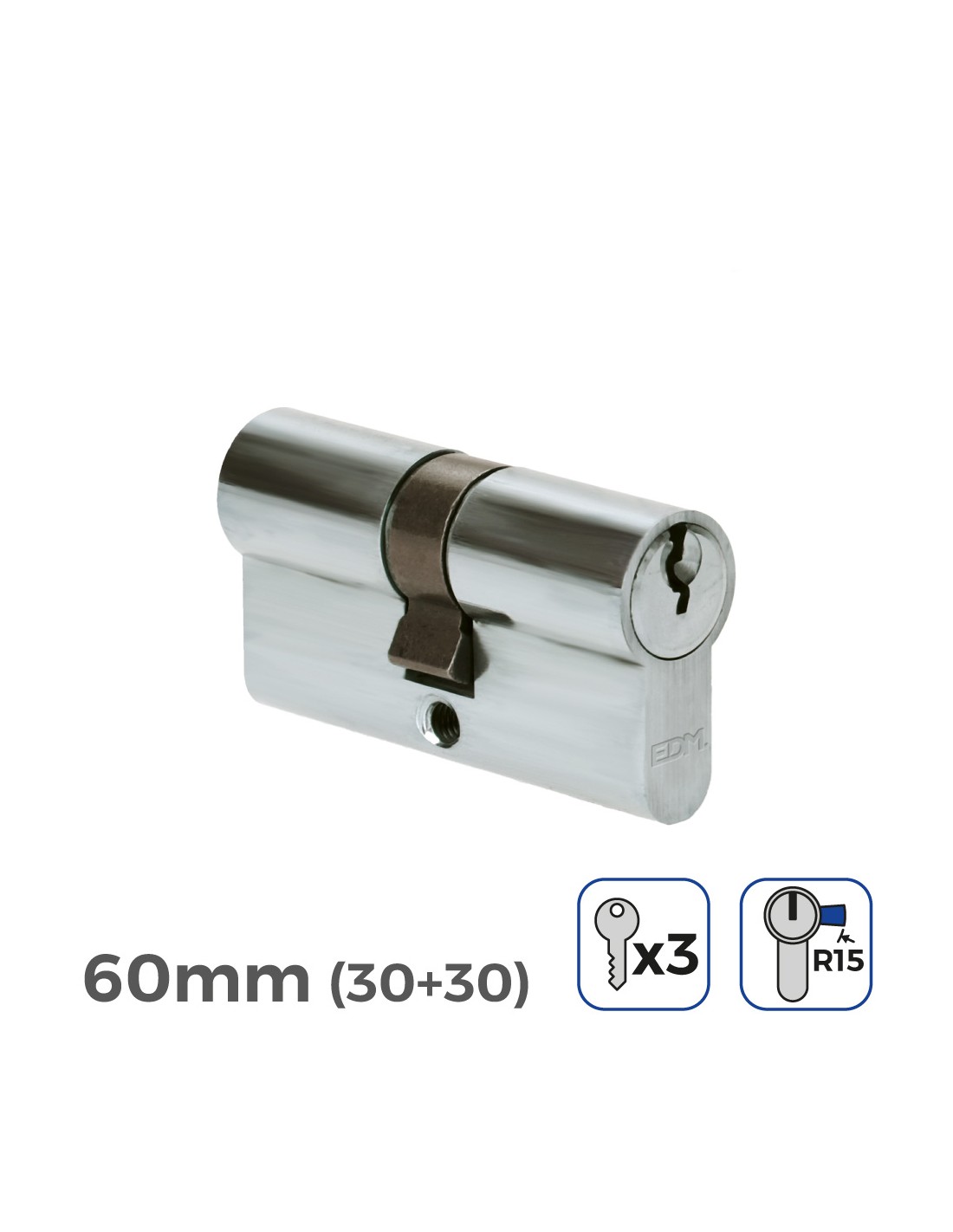 Cilindro 60mm (30+30mm) niquelado, leva larga r15 con 5 llaves seguridad incluidas