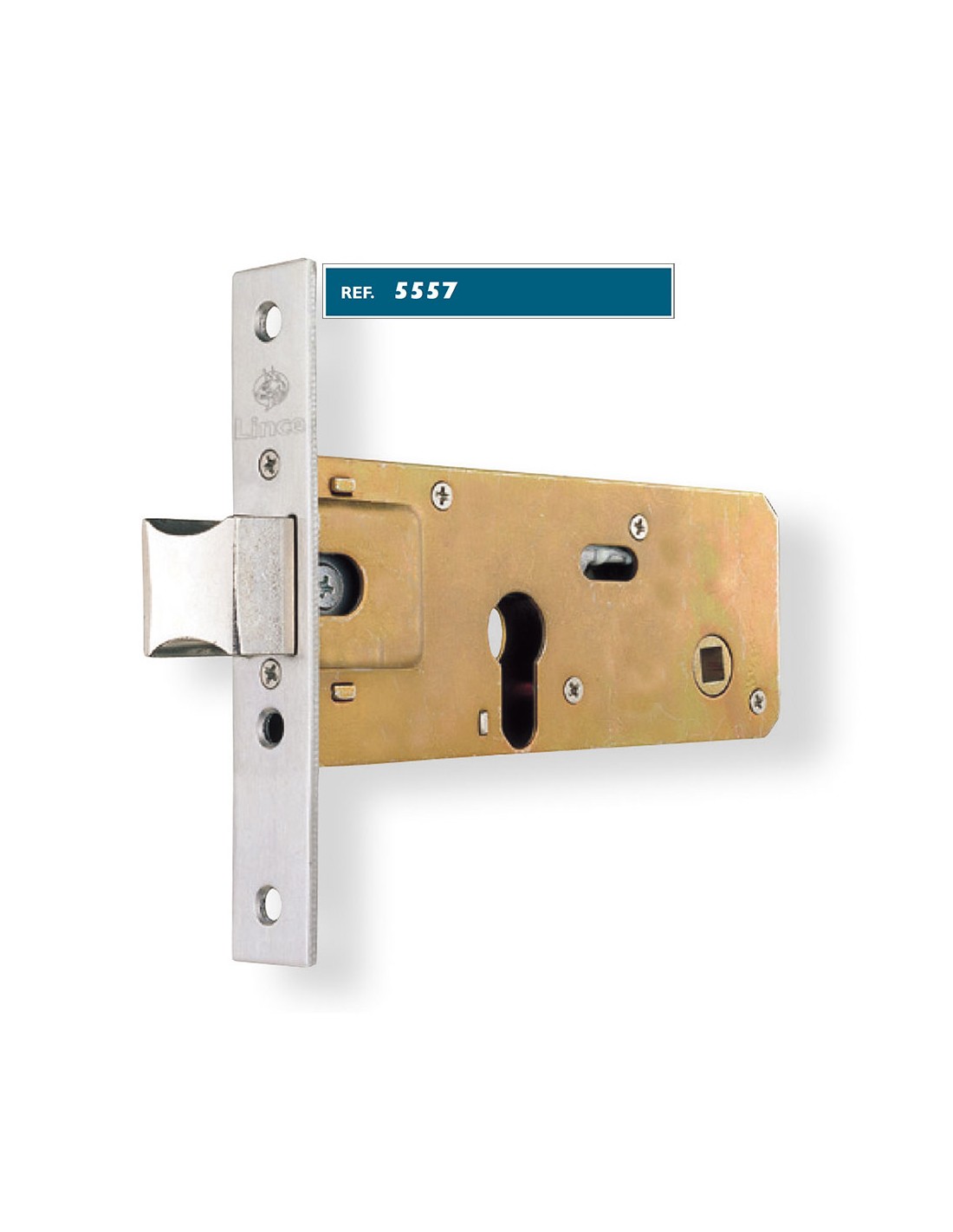 Cerradura 5557 entrada 60mm. 9555760 lince cerradura para perfiles de zócalo 5557. cerradura de cierre mediante solo picaporte reversible, accionable por manilla (nueca 8mm), y/o con 2 vueltas de llave del cilindro. entradas disponibles: 60 ó 70mm. frente acero inoxidable. incluye cilindro tradicional europerfil níquel, 6030+30mm y tres llaves de serreta en acero niquelado. medidas envase: 16,5x19,5x2,5cm. peso: 0,736kg.