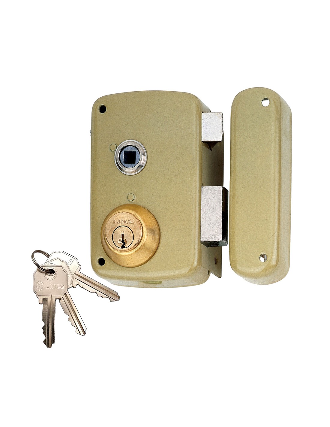 Cerradura sobreponer con cilindro 5056b entrada 60mm. mano derecha 95056bhe60d lince cerradura sobreponer 5056b. cuando no es posible instalar una cerradura de embutir, las cerraduras de sobreponer son la solución adecuada. lince ofrece una amplia gama donde elegir. es la seguridad que se ve. serie equipada con tubo de defensa giratorio. cerradura con cierre mediante picaporte, accionado por manivela (no incluida), y palanca deslizante de 1 vuelta accionable con llave. nota: la llave no actúa sobre el picaporte, precisa de manilla por ambos lados. guarda mano. se suministra con 3 llaves tipo serreta en acero níquel y un escudo embellecedor. acabados: bicapa-oro o bicapa-plata. medidas envase: 10x15x9,7cm. peso: 0,890kg.