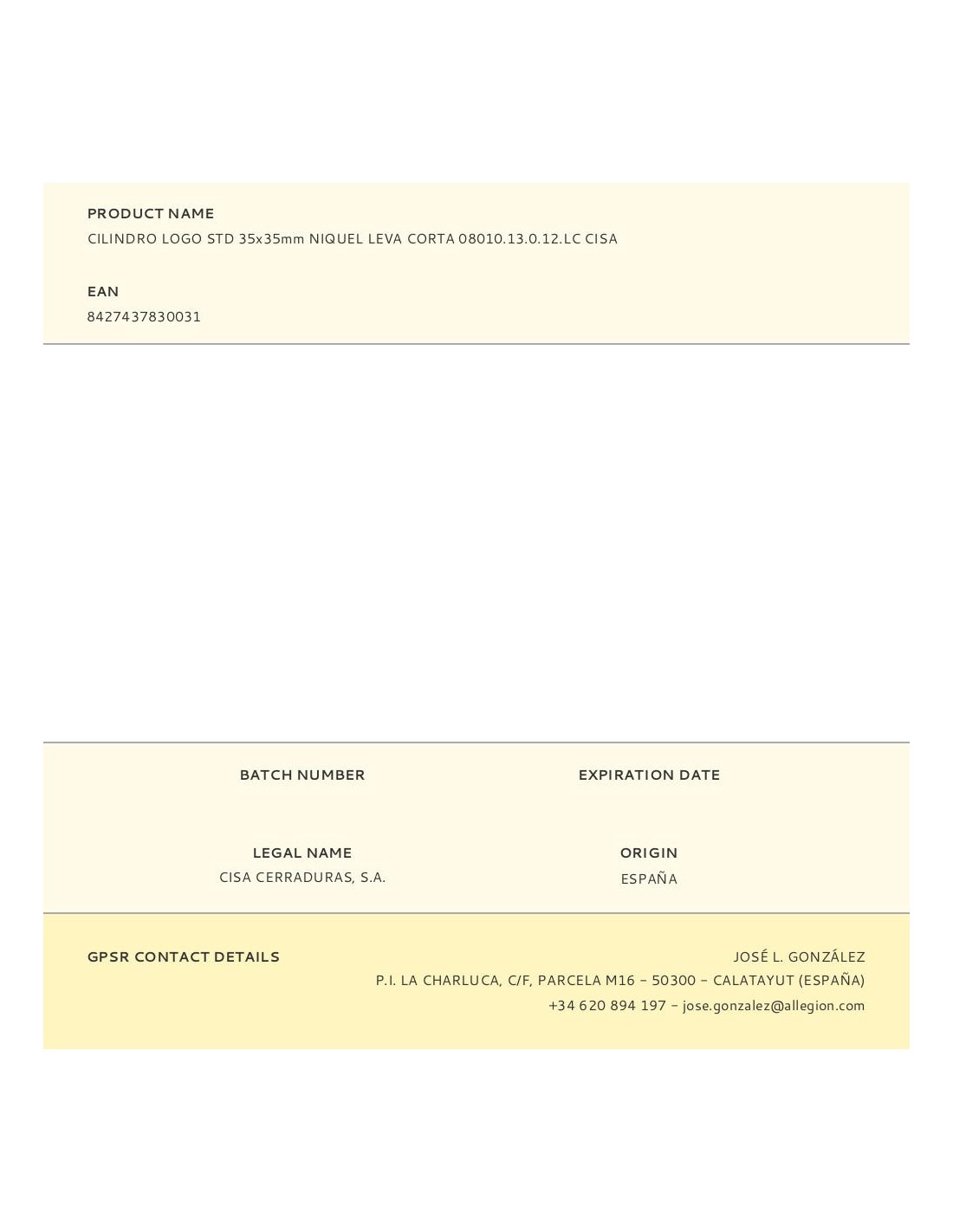 Cilindro logo std 35x35mm niquel leva corta 08010.13.0.12.lc cisa cilindro logo std 35x35mm niquel leva corta con sistema de 6 pitones y contrapitones con llave reversible de puntos. 5 llaves