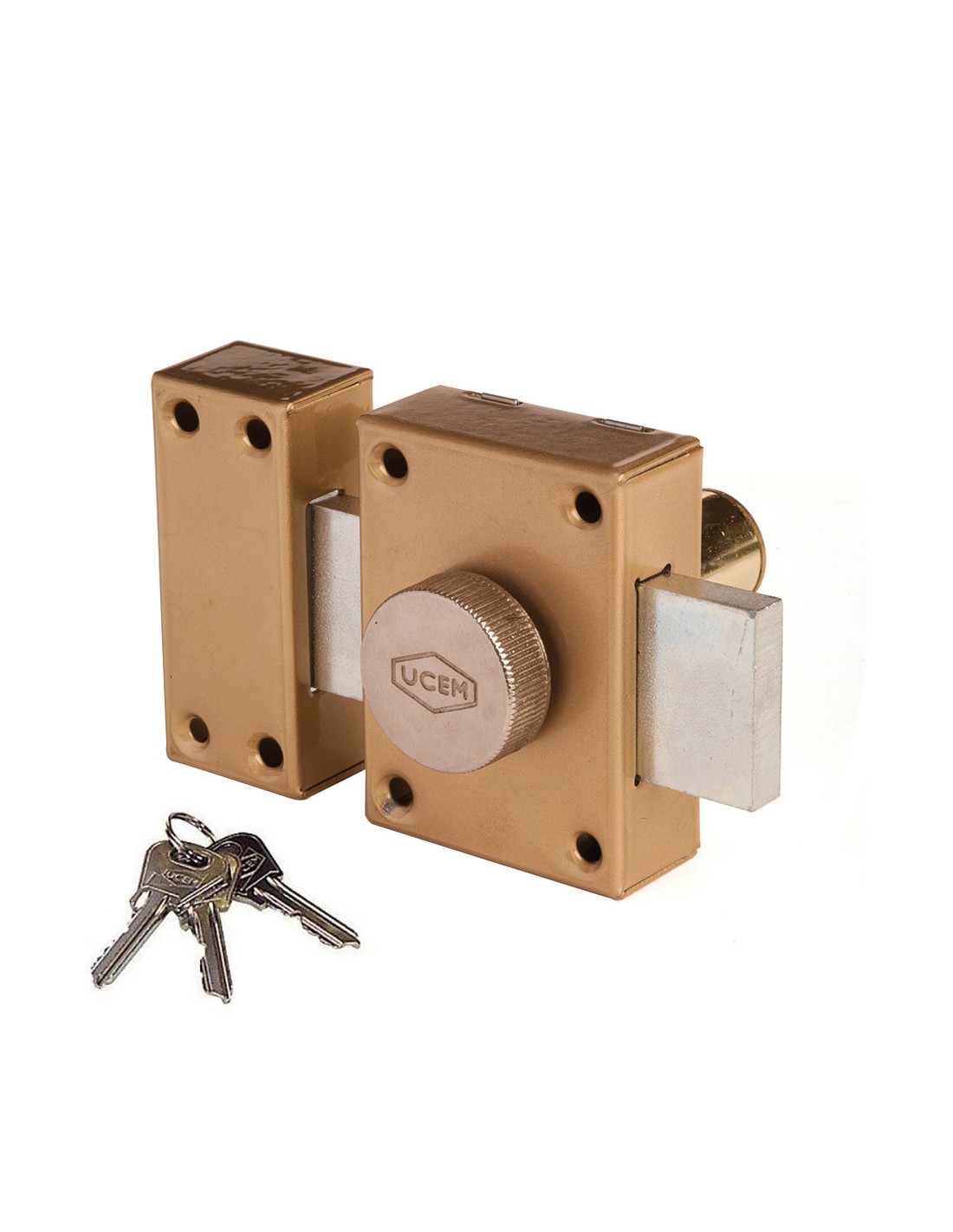 Cerrojo con palanca y 3 vueltas de cierre 4101hb ucem cerrojo de sobreponer con palanca y 3 vueltas de cierre. la palanca se acciona con llave por el exterior y por botón en el interior. acabado hierro bricomatado (dorado) 3 llaves de serreta incluidas