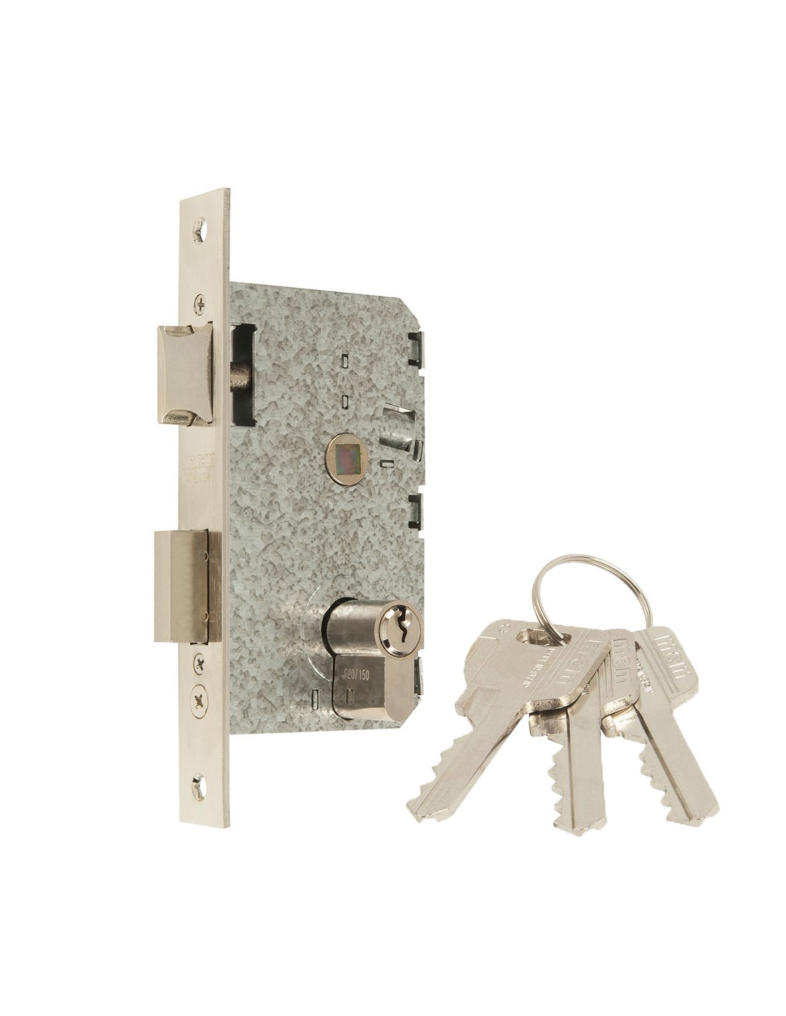 Cerradura de embutir 1 punto 2501-145an311 mcm medida entre ejes 47mm / picaporte y palanca / cilindro serie e, acabado niquelado. entrada 45. contiene 3 llaves de serreta