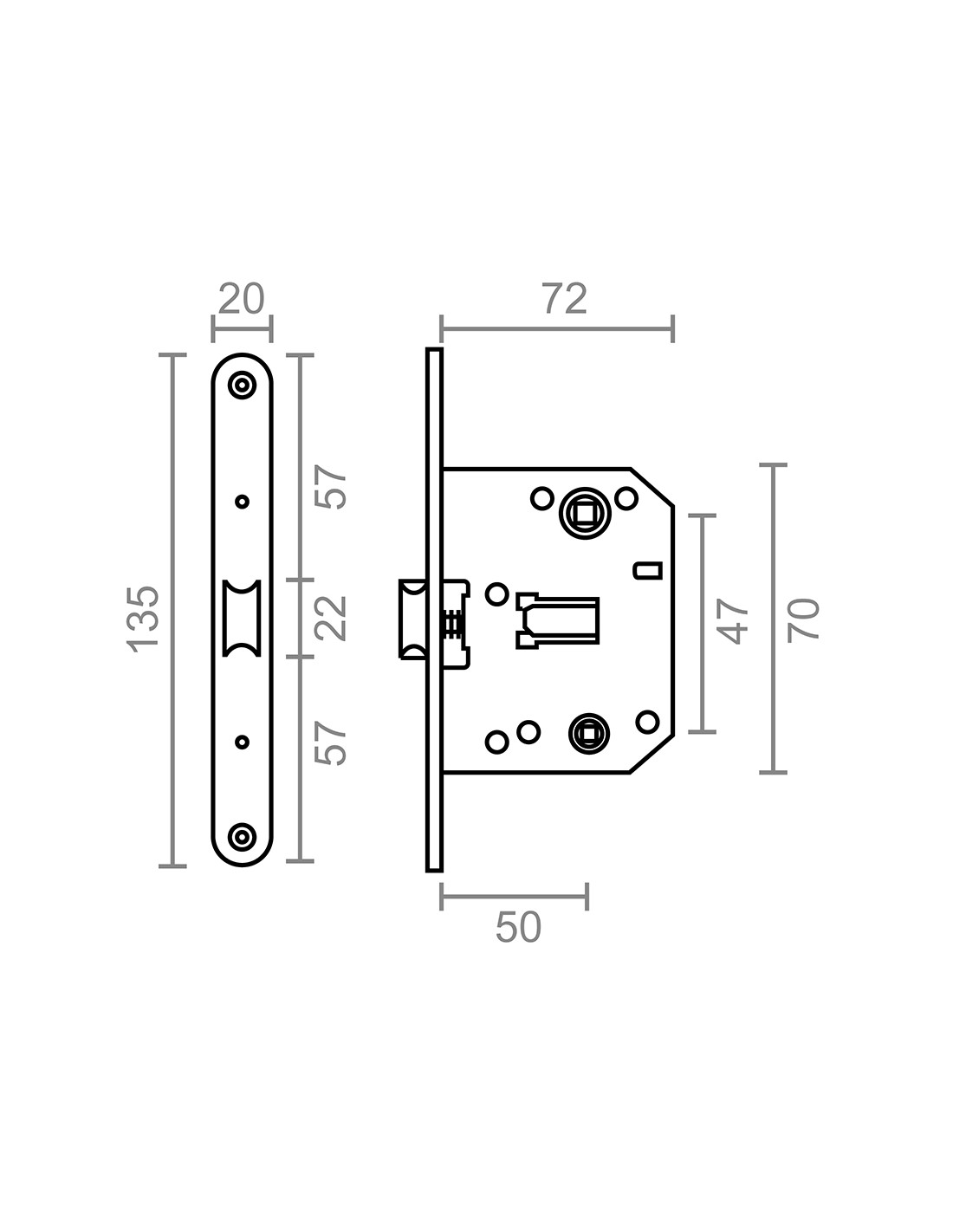 Blister picaporte condena pct01. con remate y canto redondo. distancia entre cuadradillos 47mm.medida 135x75x20mm. valido para manilla con placa.material acero. acabado niquel satinado. (tornillos incluidos)