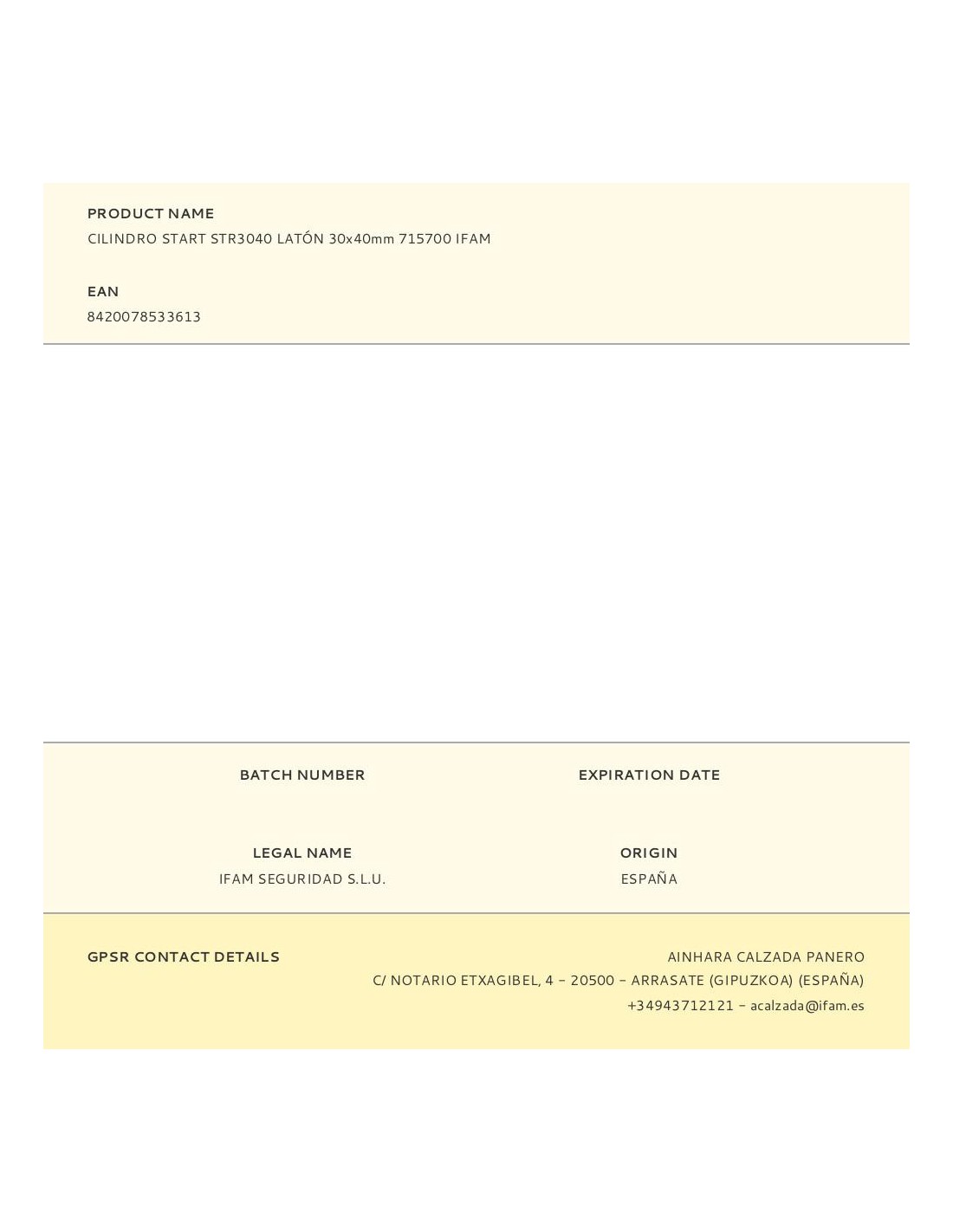 Cilindro start str3040 latón 30x40mm 715700 ifam cilindro con perfil para llaves de seguridad con acabado latón. con perfil europeo. fila de 6 pitones de acero. cuerpo de latón extruido. se suministra con 5 llaves de acero niqueladas. se suministra en caja con euro-colgador. peso (kg): 0,274. dimensiones (cm): 7,36x1,68x3,27cm