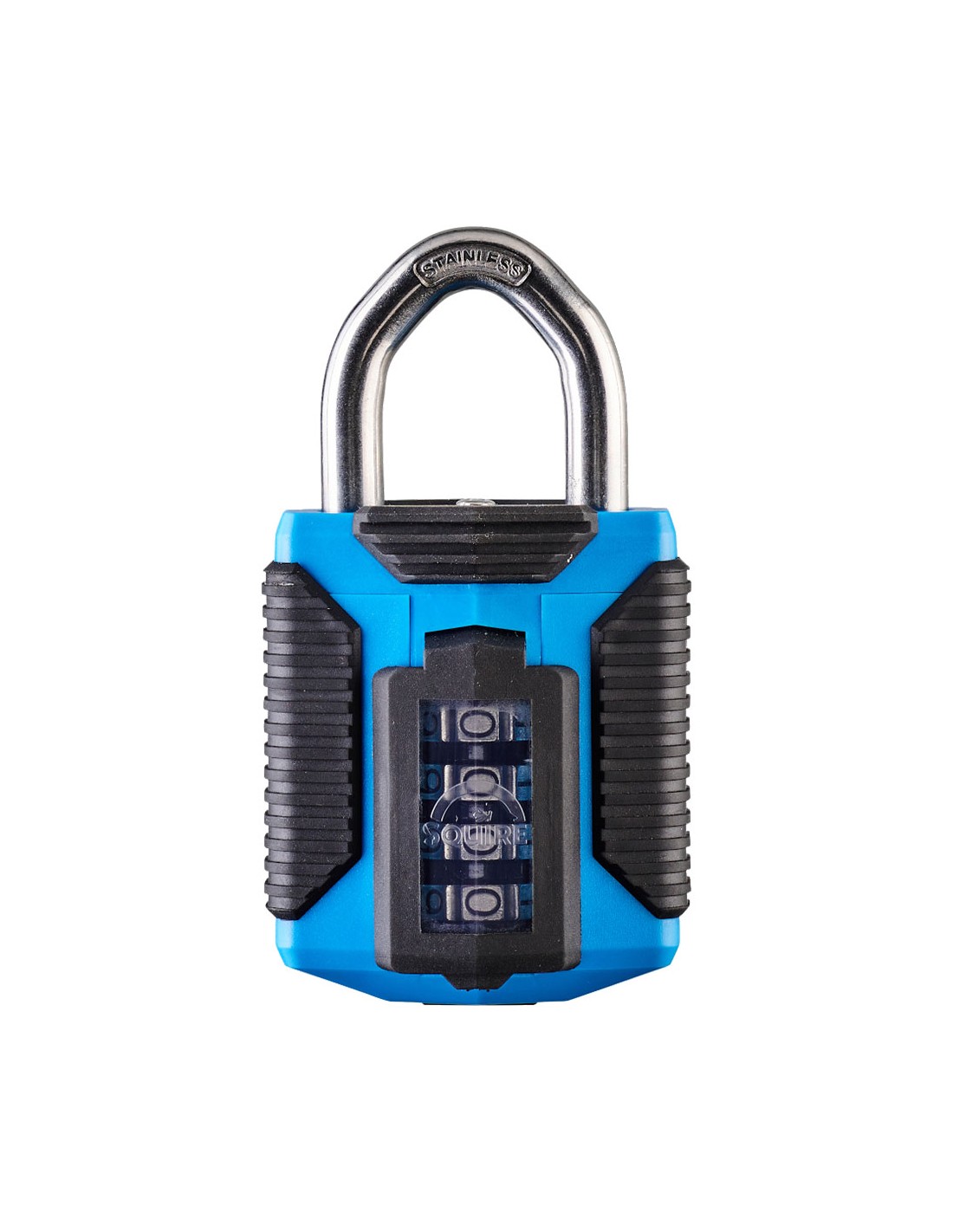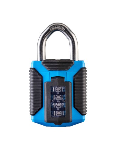 Candado de combinación de 50 mm. cubierta resistente a la intemperie. arco de acero inoxidable de 8 mm. combinación recodificable de 4 ruedas con 10000 combinaciones. diseñado y fabricado en el reino unido. mecanismo antiganzúa extra seguro. apto para entornos marinos, probado 312 h en salpicaduras salinas. apertura mediante pulsador para abrir y cerrar con una sola mano.