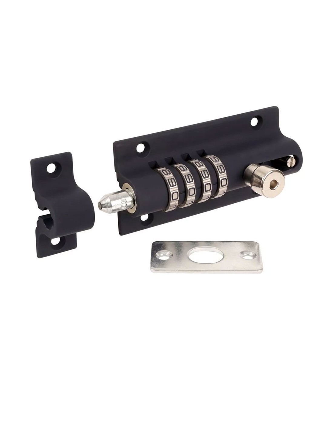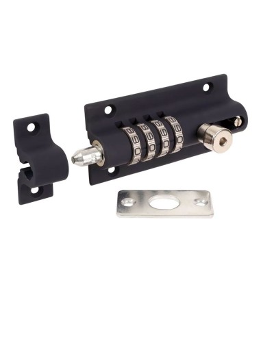 Pasador con combinación de 4 dígitos de hasta 10000 combinaciones. resiste entornos difíciles. fácil de usar, sustituyen a la necesidad de candado y grapa. ideales para cobertizos y almacenes. acabado fundido negro. incluye tornillería. 120 x 50 mm