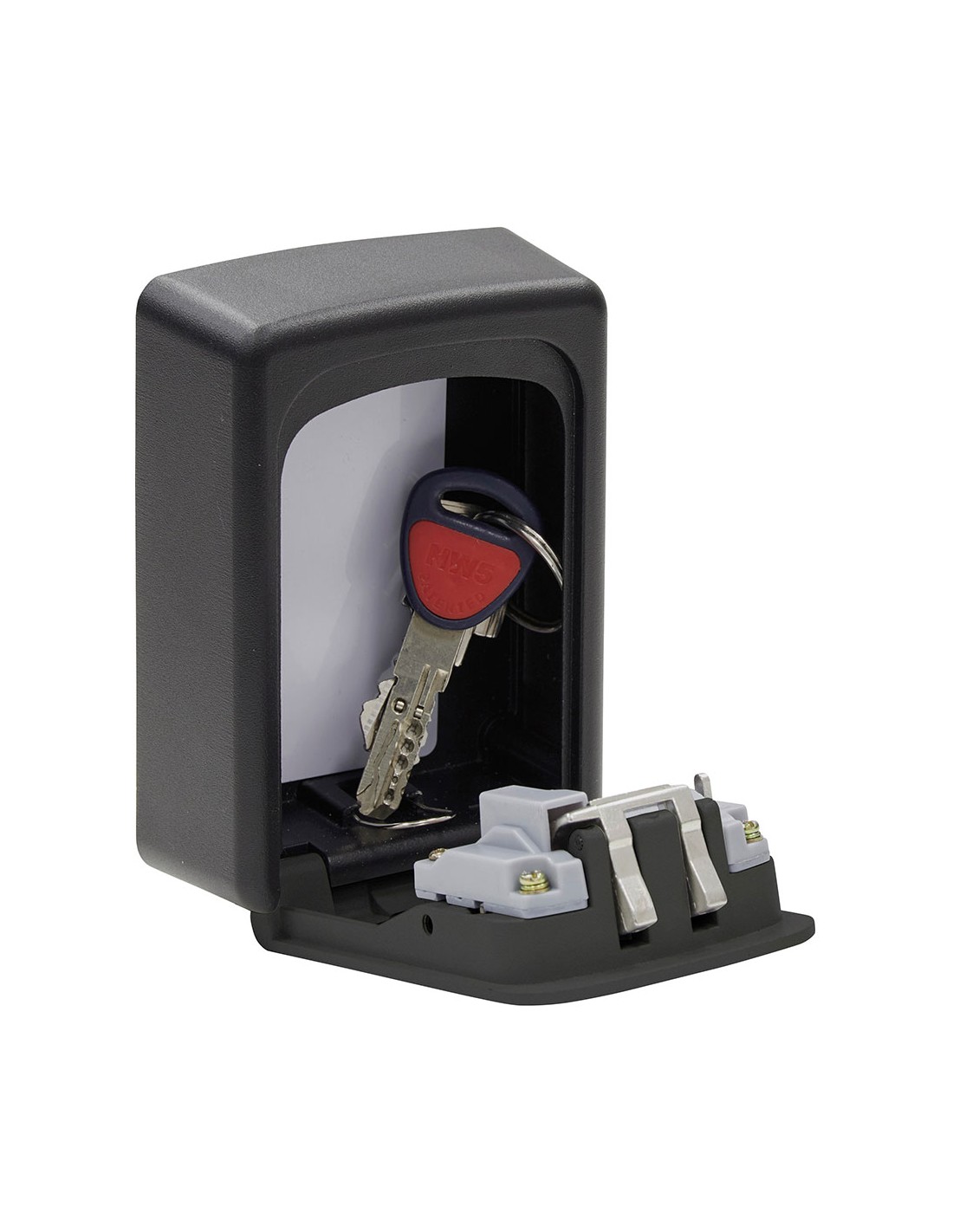 Caja guarda llaves, material: aleación de aluminio ligera y resistente a golpes y agresiones, adecuada para guardar dentro llaves, tarjetas o pequeños objetos de valor apertura y cierre de combinación de 4 dígitos configurables con tapa protectora que protege el cierre de combinación y lo mantiene oculto para exterior con orificios en la parte trasera para montaje en pared, tornillería incluida color: negro medidas: interior 83 (útil 47) x 64 x 28 mm, exterior 90 x 40 x 121 mm