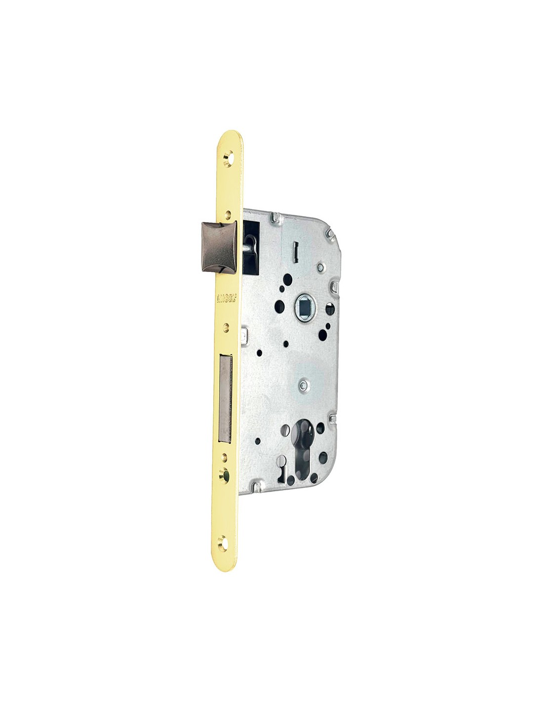 Cerradura embutir cre05 para cilindro de perfil europeo con leva larga (l15) para instalar en puertas de madera, con canto redondo, picaporte reversible y nueca para cuadrillo de 8 mm esta cerradura tiene una distancia entre ejes de 70 mm y viene preparada con una entrada de 50 mm no incluye cilindro incluye protector de escudo, cerradero y tornillería fabricada en acero, acabado en latonado