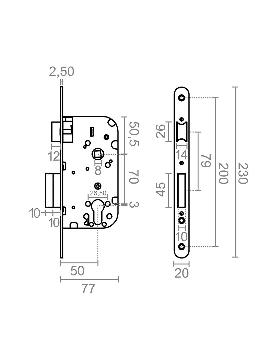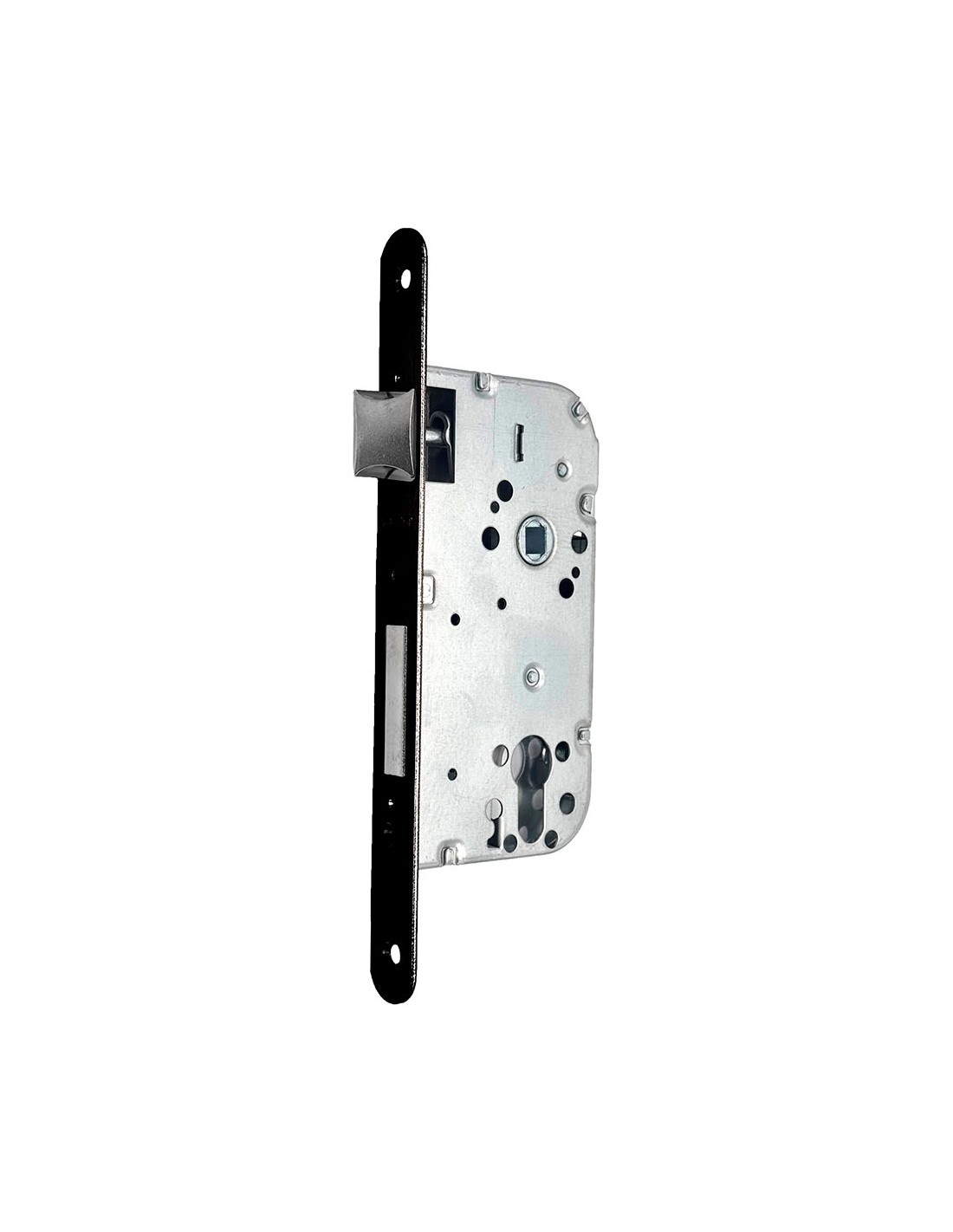 Cerradura embutir cre05 para cilindro de perfil europeo con leva larga (l15) para instalar en puertas de carpintería de madera, con canto redondo, picaporte reversible y nueca para cuadrillo de 8 mm esta cerradura tiene una distancia entre ejes de 70 mm y viene preparada con una entrada de 50 mm no incluye cilindro incluye protector de escudo, cerradero y tornillería fabricada en acero, acabado en negro