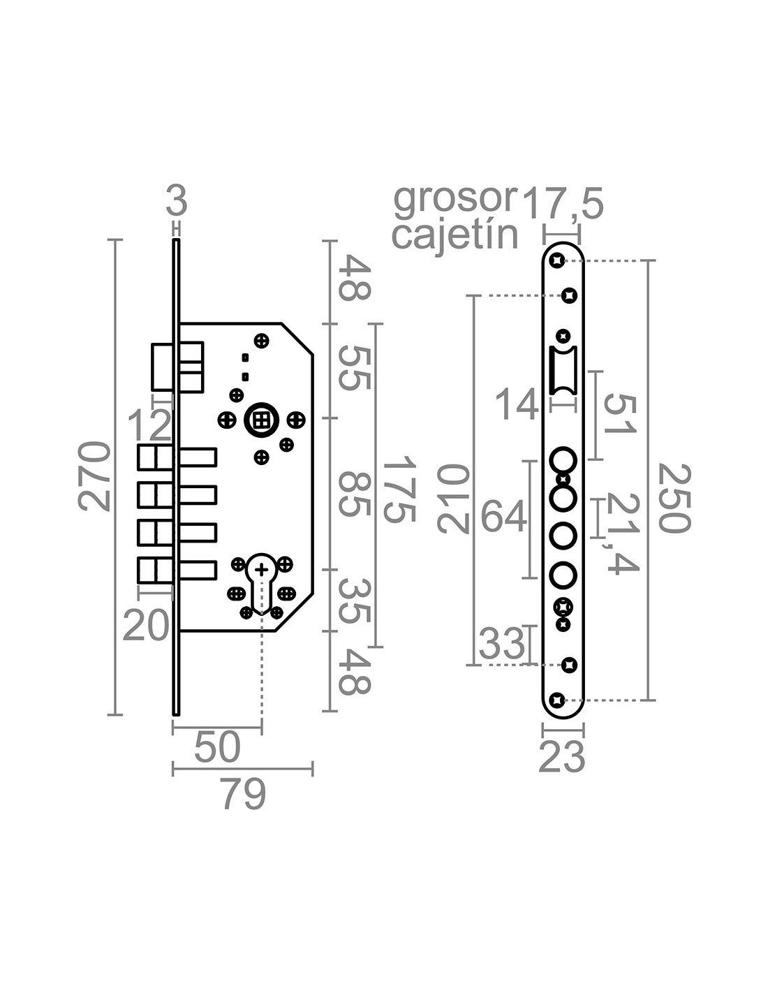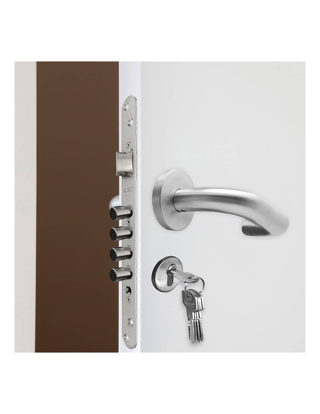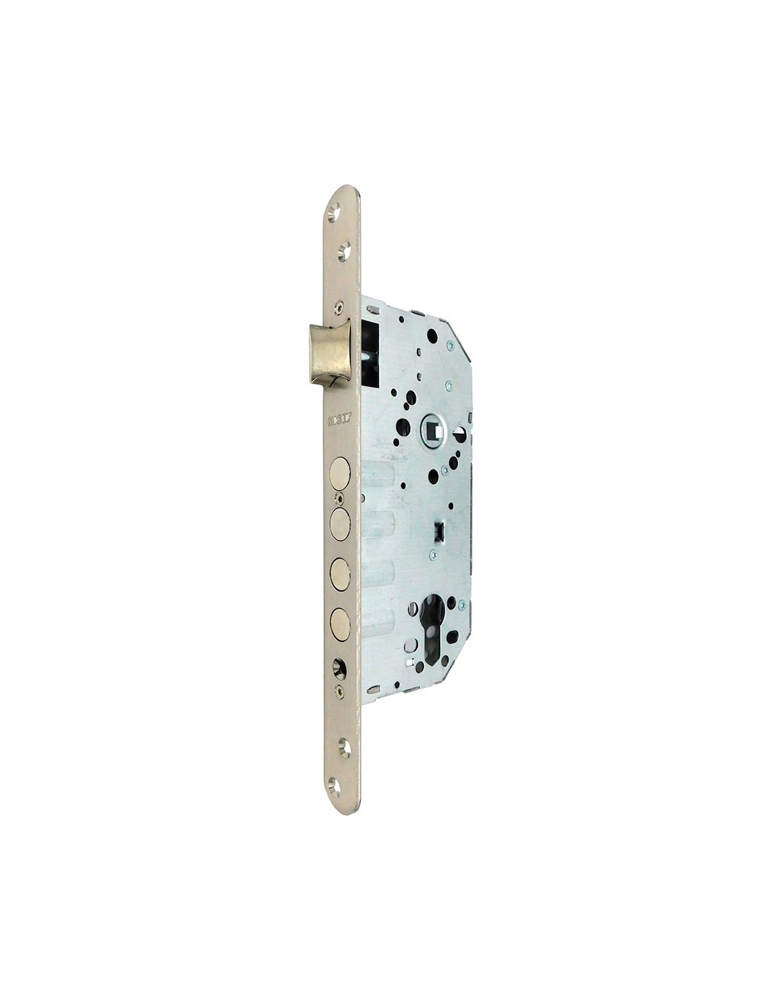 Cerradura embutir cre07 para cilindro de perfil europeo con leva larga (l15) y con 4 bulones de cierre para instalar en puertas de carpintería de madera, con canto redondo, resbalón reversible y nueca para cuadradillo de 8 mm esta cerradura tiene una distancia entre ejes de 85 mm y viene preparada con una entrada de 50 mm no incluye cilindro ni escudo incluye cerradero y tornillería fabricada en acero, acabado en níquel satinado
