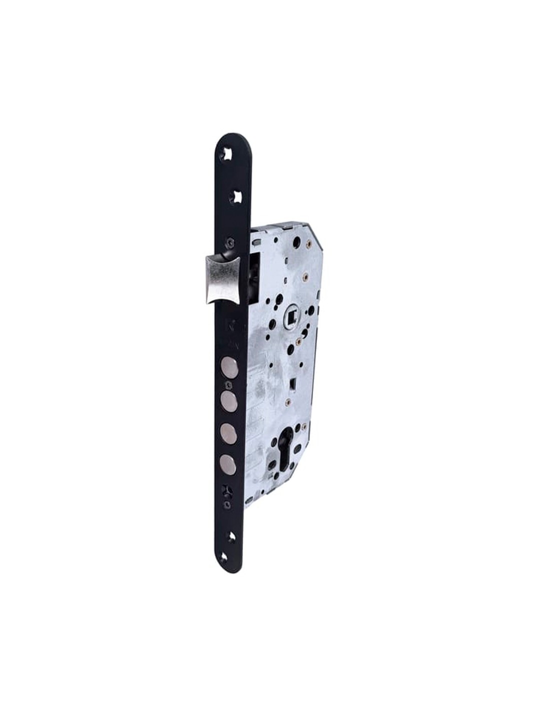Cerradura embutir cre07 para cilindro de perfil europeo con leva larga (l15) y con 4 bulones de cierre para instalar en puertas de carpintería de madera, con canto redondo, resbalón reversible y nueca para cuadradillo de 8 mm esta cerradura tiene una distancia entre ejes de 85 mm y viene preparada con una entrada de 50 mm no incluye cilindro ni escudo incluye cerradero y tornillería fabricada en acero, acabado en negro