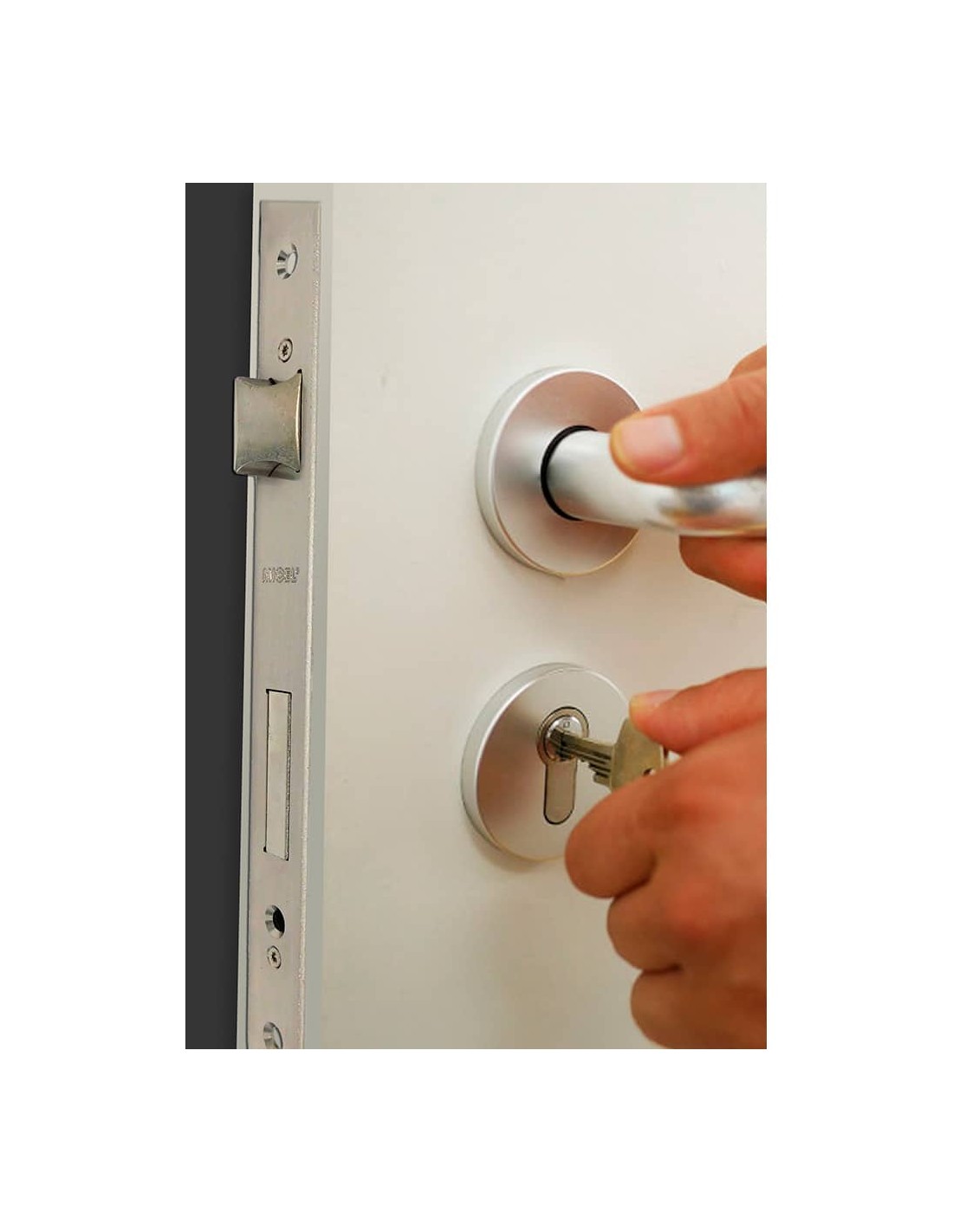 Cerradura embutir cre12 para cilindro de perfil europeo con leva larga (l15) para instalar en puertas de carpintería de madera, con canto cuadrado, picaporte reversible y nueca para cuadrillo de 8 mm esta cerradura tiene una distancia entre ejes de 85 mm y viene preparada con una entrada de 50 mm no incluye cilindro incluye protector de escudo, cerradero y tornillería fabricada en acero, acabado en niquel satinado