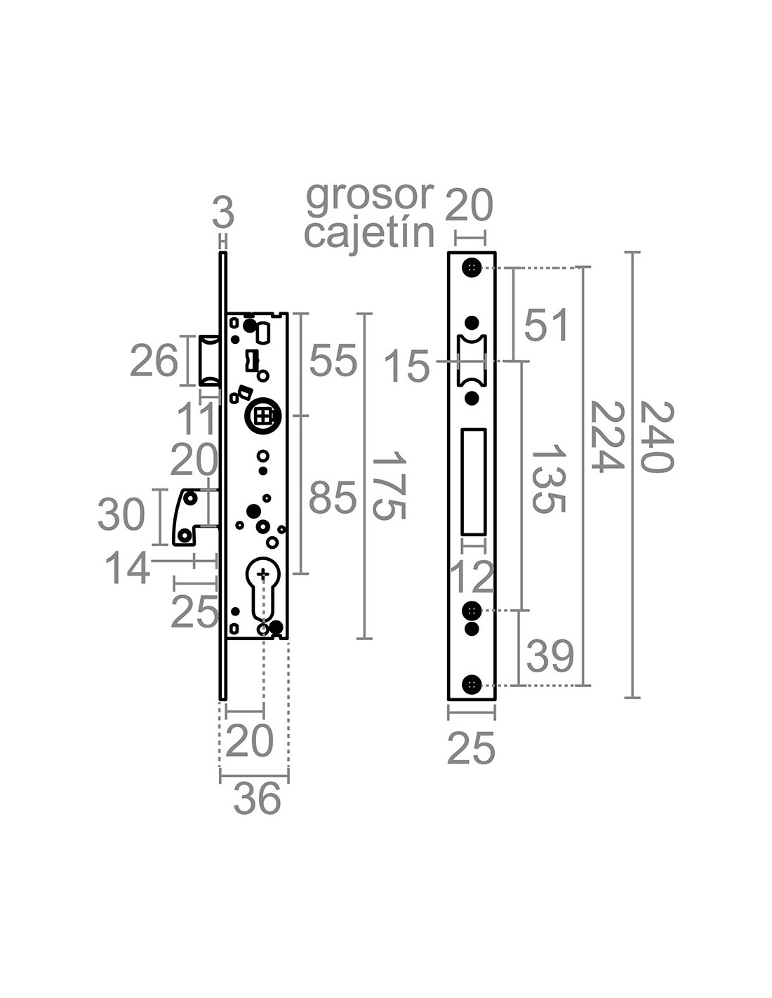 Cerradura embutir cre10 para cilindro de perfil europeo con leva larga (l15) para instalar en puertas de carpintería metálica con canto cuadrado, con gancho lámina, picaporte reversible y nueca para cuadradillo de 8 mm esta cerradura tiene una distancia entre ejes de 85 mm y viene preparada con una entrada de 20 mm no incluye cilindro incluye 2 protectores de escudo (plástico), cerradero y tornillería fabricada en acero inoxidable, acabado en inox