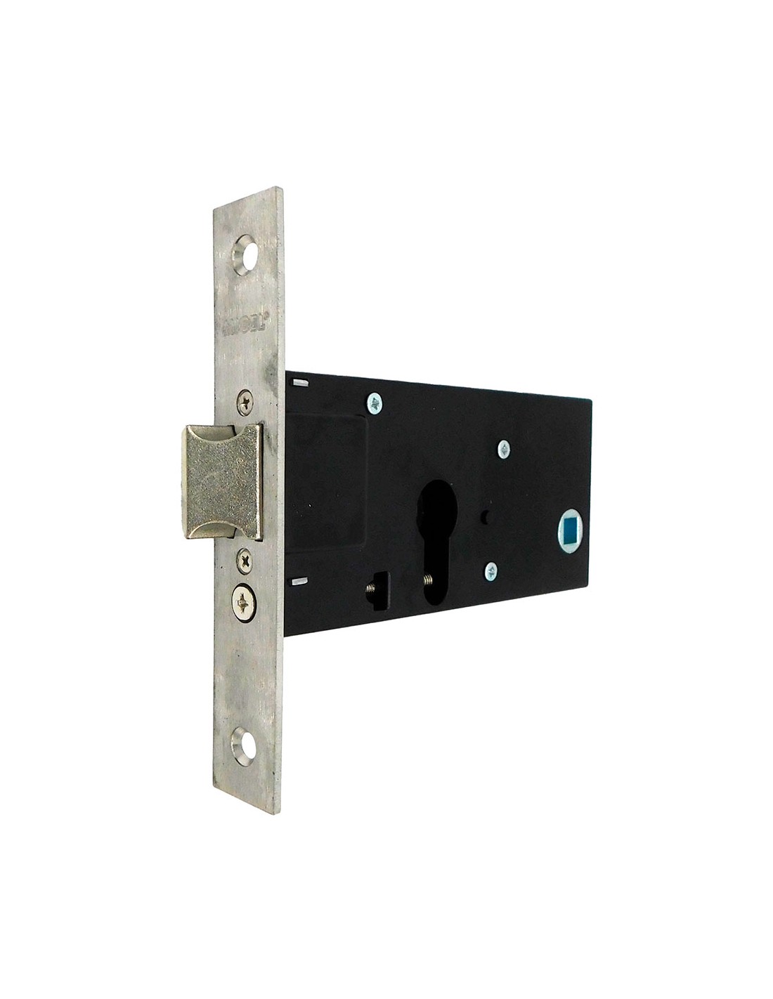 Cerradura embutir cre01 para cilindro de perfil europeo con leva larga (l15) para instalar en puertas de carpinteria metalica, con canto cuadrado y reversible, es válida para instalar manillas con tornillos pasantes cuadradillo de 8 mm incluye 2 escudos de plástico no incluye cilindro ni cerradero esta cerradura viene preparada con entrada de 60 mm fabricada en acero inoxidable, acabado en inox