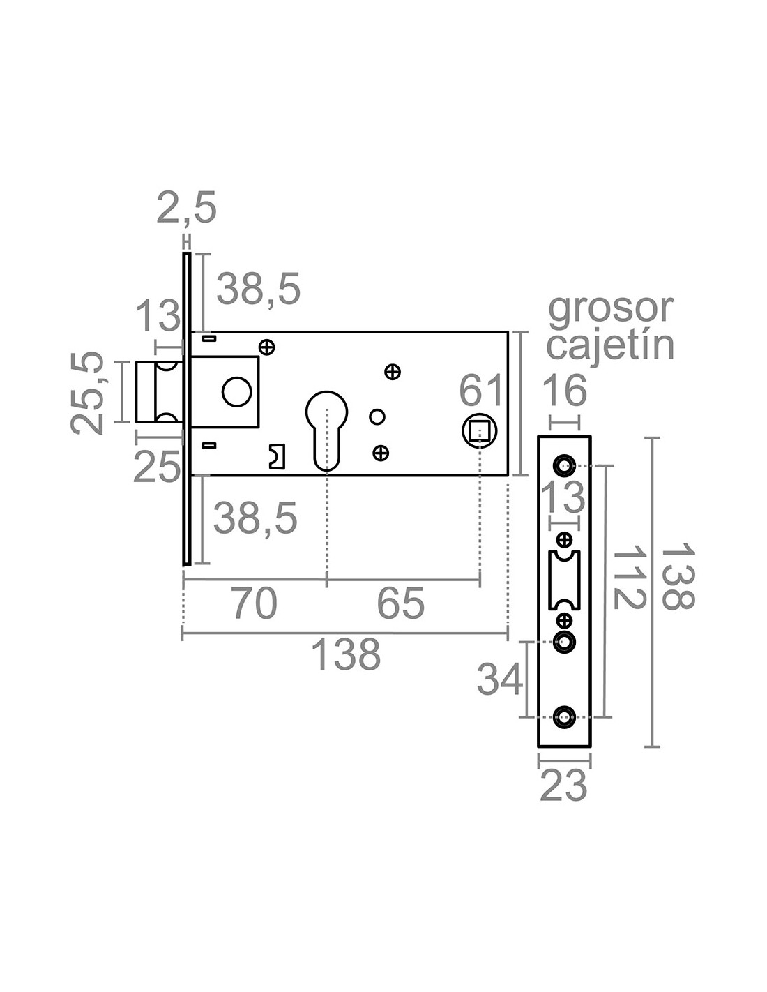 Cerradura embutir cre01 para cilindro de perfil europeo con leva larga (l15) para instalar en puertas de carpintería metálica, con canto cuadrado y reversible, es válida para instalar manillas con tornillos pasantes cuadradillo de 8 mm incluye 2 escudos de plástico no incluye cilindro ni cerradero esta cerradura viene preparada con entrada de 70 mm fabricada en acero inoxidable, acabado en inox