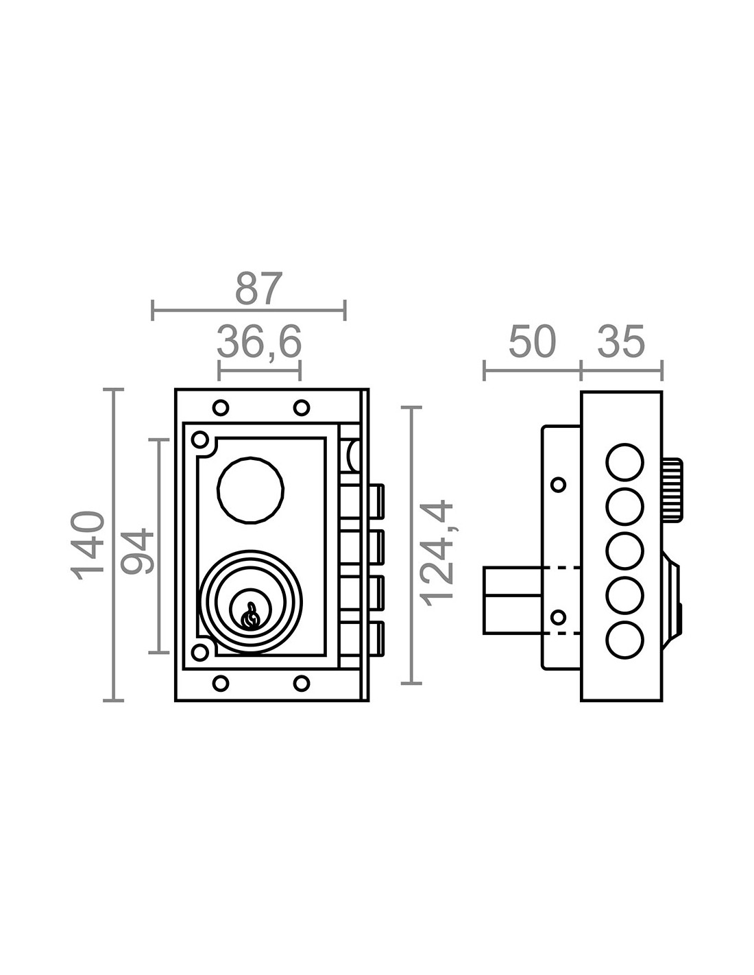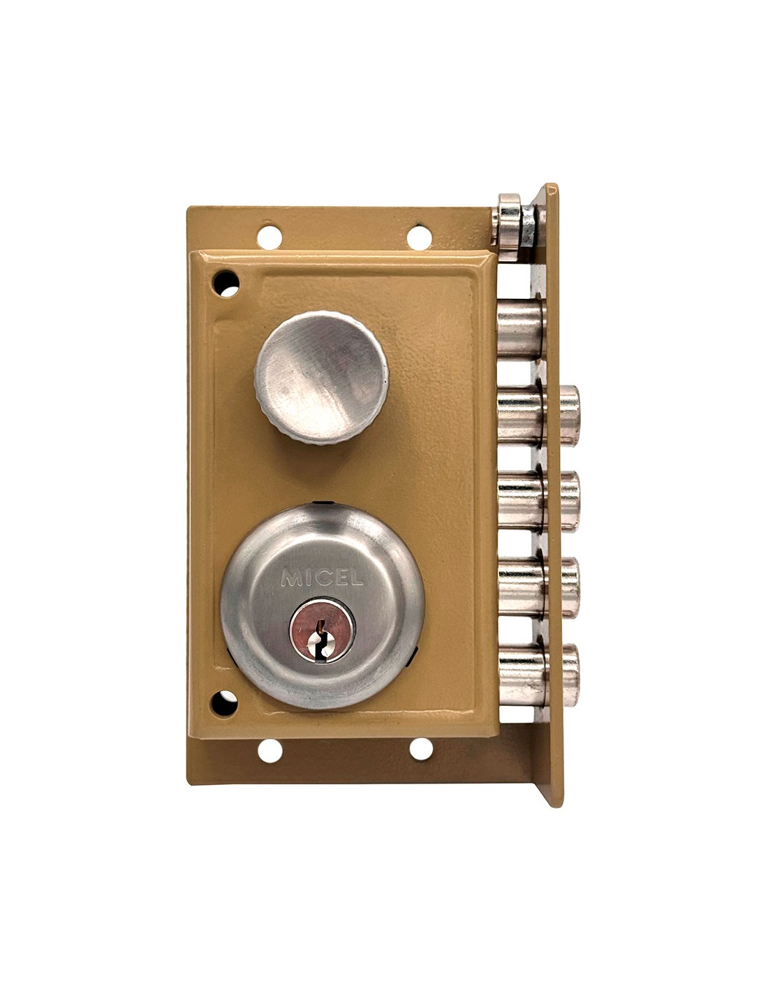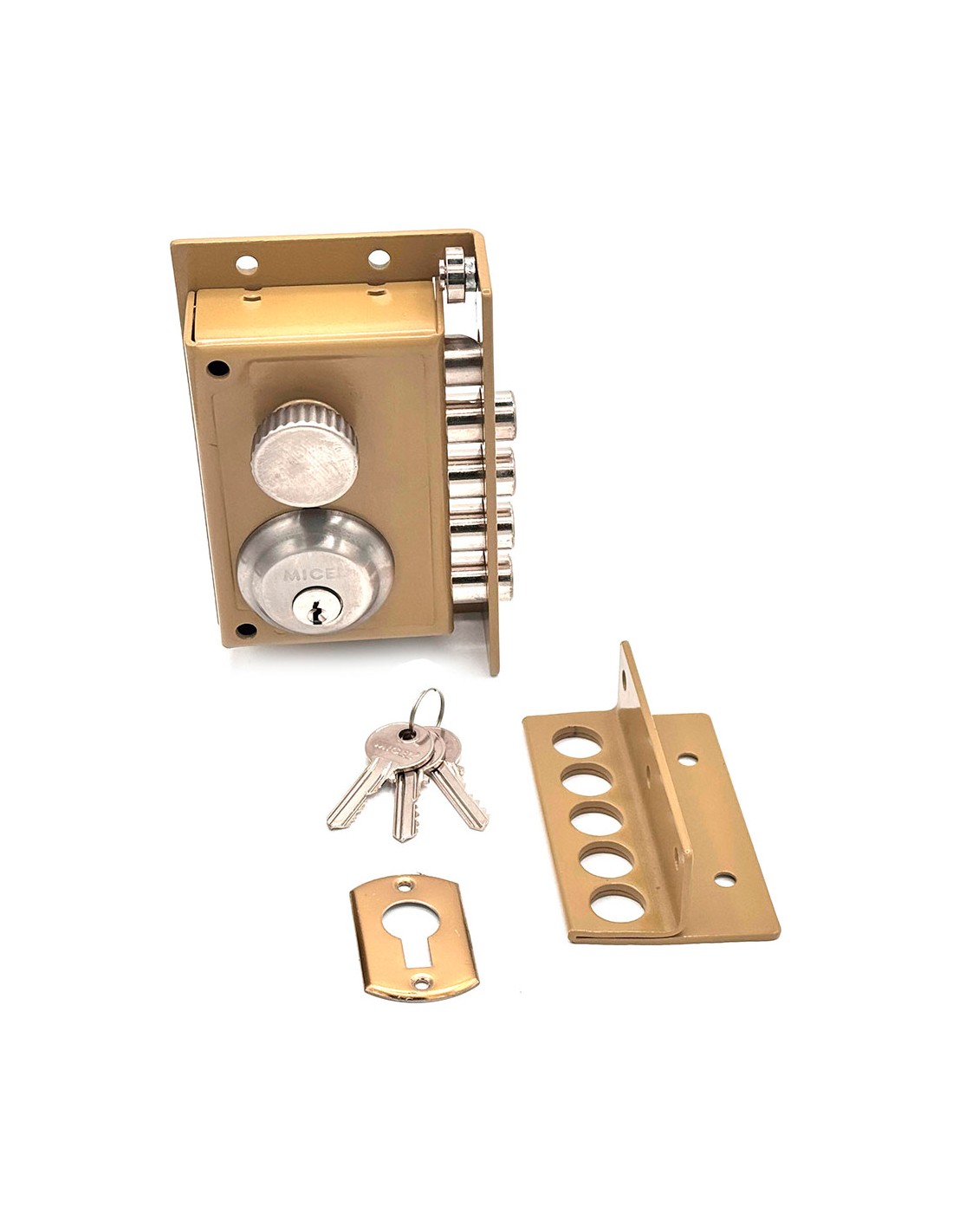 Cerradura de sobreponer crs01 con cilindro redondo para reforzar la seguridad mediante su instalación esta referencia no es reversible, siendo indicada para puertas de madera de mano izquierda el accionamiento interior se realiza mediante ruleta, mientras que el exterior se realiza mediante llave a través del cilindro incluye 3 llaves de serreta, palanca de cierre, lengüeta y tirador la llave en bruto para copias adicionales es la referencia 10875 fabricado en acero, acabado pintado en oro