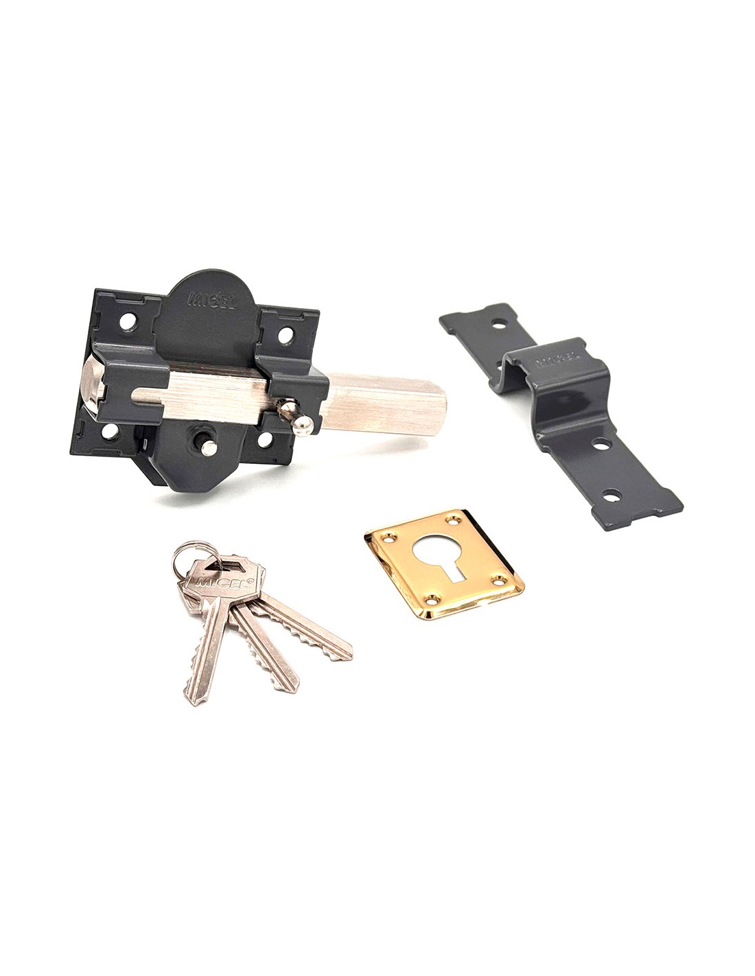 Cerrojo de sobreponer crr08 con placa de 86 mm y cilindro con boca pera de 50 mm para reforzar la seguridad mediante la instalación en cualquier tipo de puerta además, al ser reversible no guarda mano el accionamiento interno se realiza mediante un botón, mientras que el exterior se realiza mediante llave a través del cilindro con llaves iguales amaestradas de serreta tipo a fabricado en acero, acabado pintado en gris