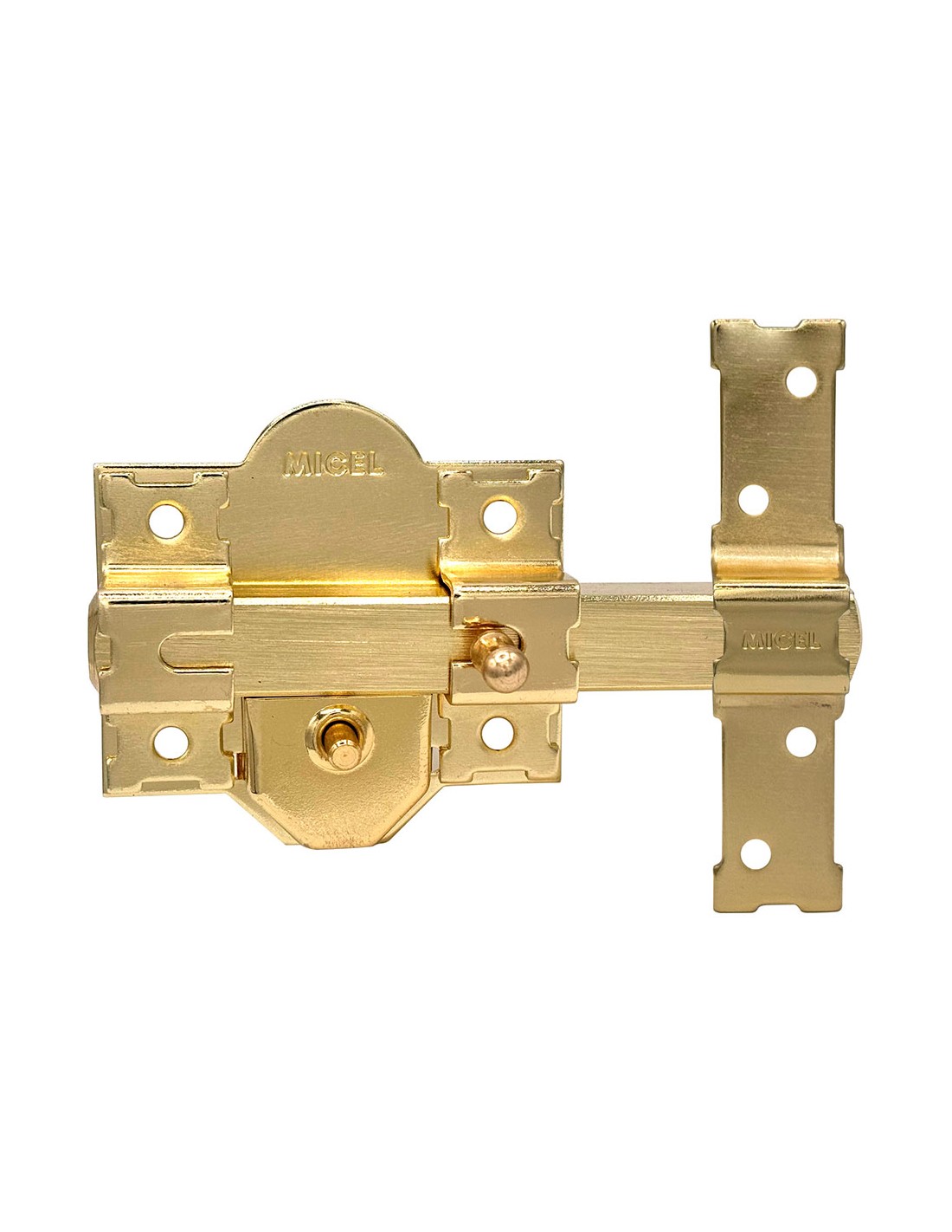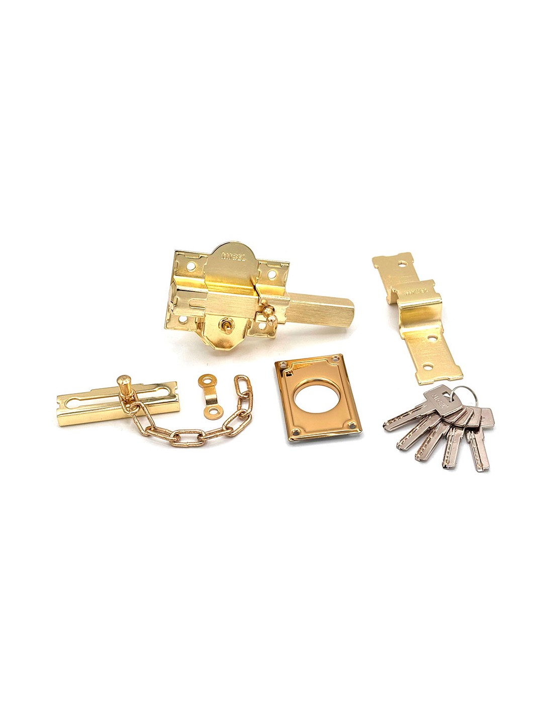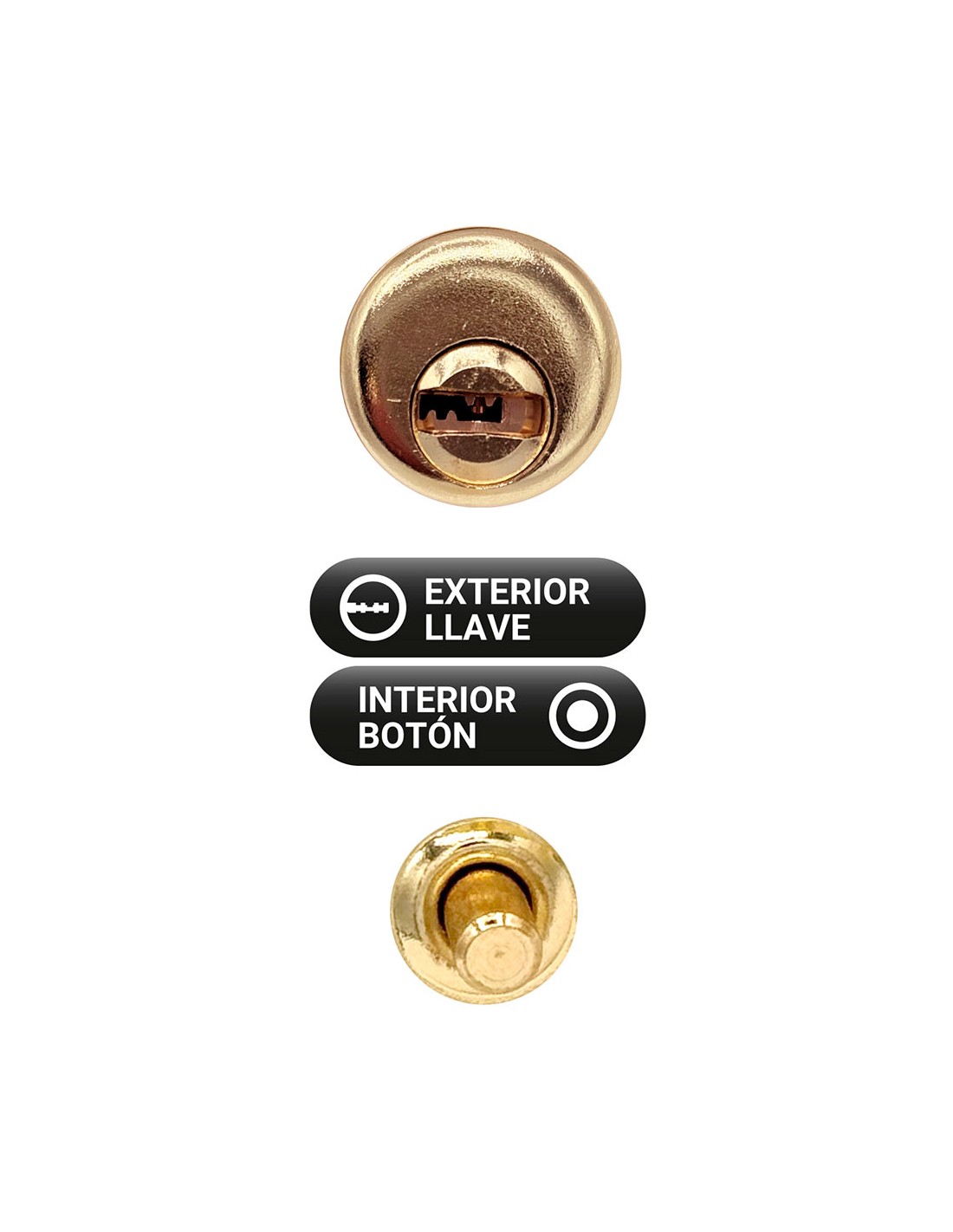 Cerrojo de sobreponer crr10 con placa de 86 mm y cilindro redondo de 50 mm para reforzar la seguridad mediante la instalación en cualquier tipo de puerta además, al ser reversible no guarda mano el accionamiento interno se realiza mediante un botón, mientras que el exterior se realiza mediante llave de seguridad a través del cilindro con 5 llaves de seguridad además, incluye cadenilla, protector de cilindro y sistema antibumping fabricado en acero, acabado en latón satinado