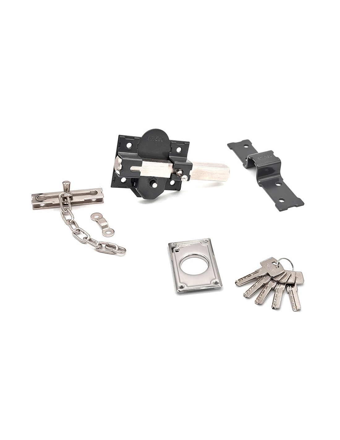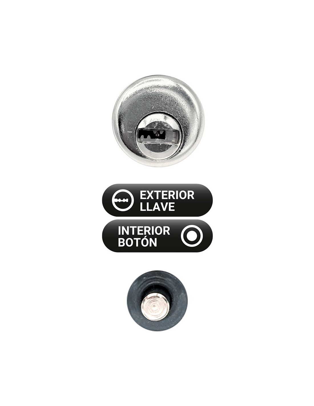 Cerrojo de sobreponer crr10 con placa de 86 mm y cilindro redondo de 50 mm para reforzar la seguridad mediante la instalación en cualquier tipo de puerta además, al ser reversible no guarda mano el accionamiento interno se realiza mediante un botón, mientras que el exterior se realiza mediante llave de seguridad a través del cilindro con 5 llaves de seguridad además incluye cadenilla, protector de cilindro y sistema antibumping fabricado en acero, acabado pintado en gris