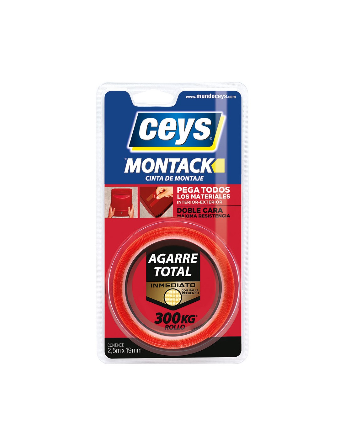 Cinta doble cara montack agarre total 19 mm x 2,5 m, blister. para pegar y fijar todos los materiales. sustituye clavos, tornillos y tacos relleno y resistencia fija zócalos, rodapiés, molduras, perfiles, travesaños, azulejos, cajas de electricidad, rejillas de ventilación montaje de paneles para revestimientos en paredes, marcos de puertas, estanterías.