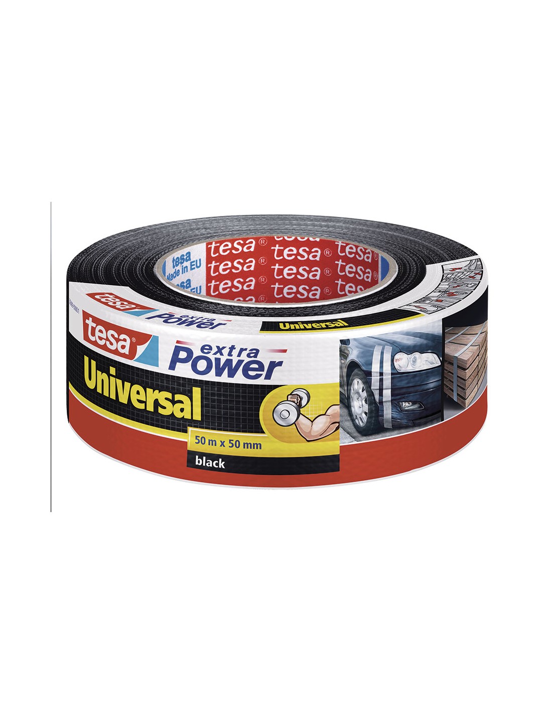 Cinta americana extra power universal negra 50 mm x 50 m. extra power universal. de tesa es una cinta adhesiva multiuso caracterizada por un fuerte poder de pegado mayor. es una inmejorable tira con un poder de adhesión mayor y una tira de reparación muy versátil ideal para una amplia gama de aplicaciones. si bien se destaca por una fuerza superior. esta tira adhesiva puede romperse fácilmente con la mano y. por tanto. siempre será ideal para reparaciones rápidas. artesanía. pegado. atado. reforzado. marcado y mucho más. al ser un universal. la tira de reparación para aplicaciones interiores y exteriores. es suficientemente fuerte a la intemperie.