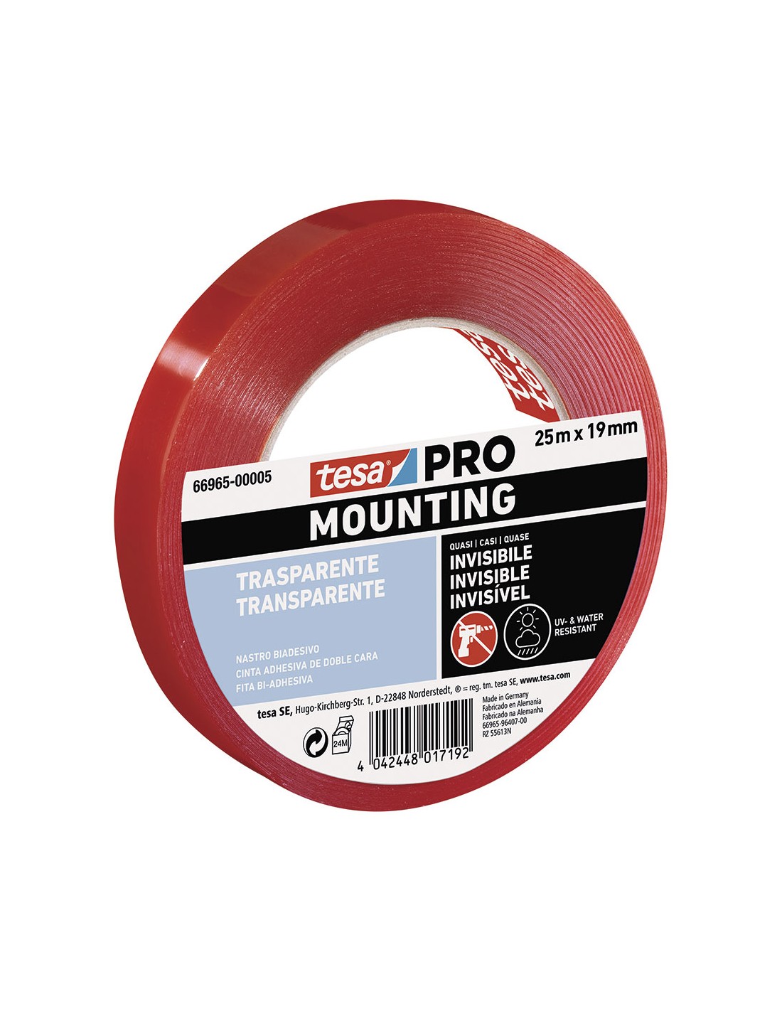 Cinta doble cara mounting pro transparente para fijar materiales transparentes o translúcidos. apropriada para el uso en exteriores. 19 mm x 25 m