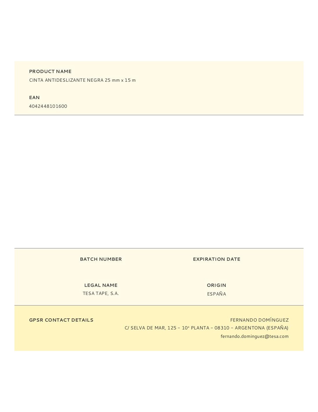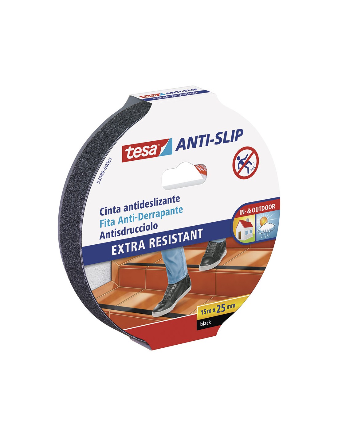 Tesa cintas antideslizantes negra 25 mm x 15 m se usa tanto en interiores como en exteriores. y proporciona un agarre firme en aquellas zonas donde la seguridad es primordial. la combinación de un sustrato de pvc recubierto de óxido de aluminio y un adhesivo acrílico ofrece un efecto antideslizante que dura hasta dos años. está certificada según la norma din 51130 y destaca por el hecho de que es resistente al agua salada y a los productos químicos. así como porque se puede cortar con la mano y quitar sin ninguna dificultad