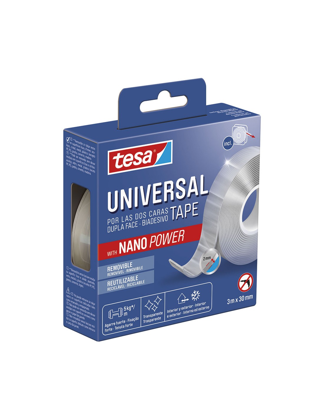 Cinta universal doble cara transparente, se puede utilizar en interiores y exteriores. fuerza adhesiva de 5 kg /m