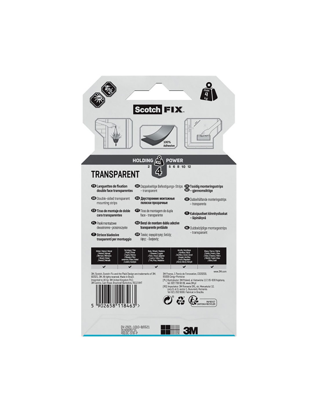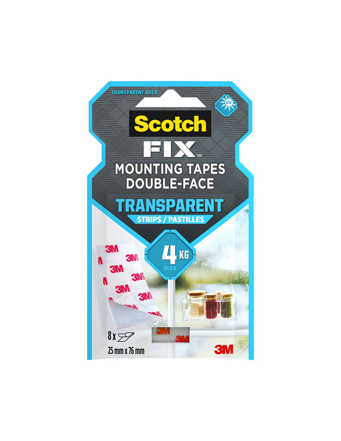 Tira adhesiva doble cara transparente, máx 4 kg, 25mmx76mm, 8 uds