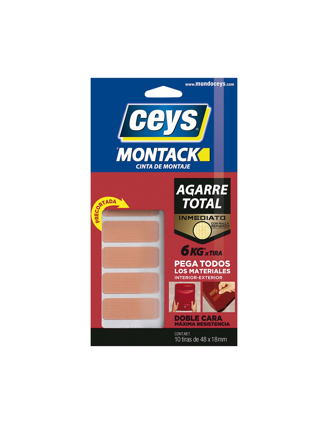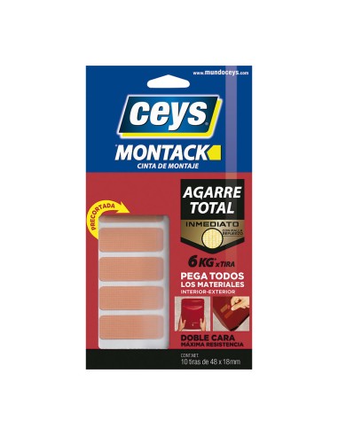 Cinta de montaje precortada montack, de doble cara, con una gran resistencia y agarre inmediato, para interior y exterior. carga máxima: 6 kg x tira. contiene 10 tiras de 48 x 18 mm