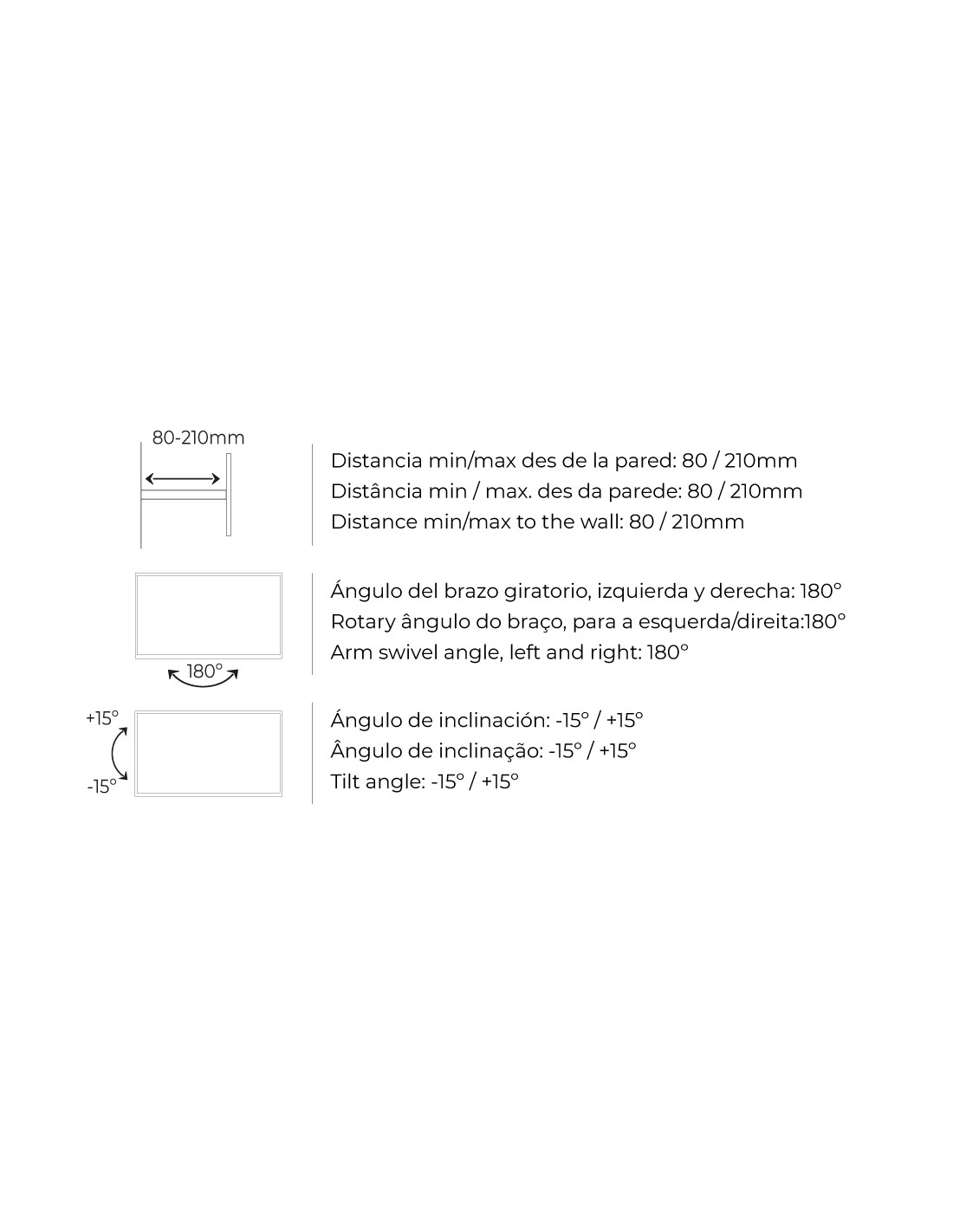 Soporte universal tv de 23-42 pulgadas 25kg con brazo inclinable -15°/+15°. giratorio:180° vesa: máx. 200x200mm. separacion de pared: 80-210mm compatible con la mayoria de las marcas. fácil instalación. incluye tornilleria.