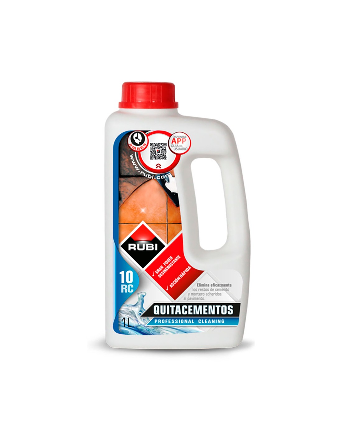 Quitacementos rc-10 1ll 23910 rubi. elimina eficazmente los restos de cemento y mortero adheridos a la superficie de la baldosa cerámica.gran poder desincrustante y su rápida acción.igualmente indicado para la limpieza de manchas de eflorescencias (salitre) sobre paredes de ladrillo, caravista, terrazas de tierra cocida o toba y otros materiales no sensibles a los ácidos.el rc-10 quitacementos es un limpiador desincrustante de base ácida fuerte.tiene un ph entre 0 y 1 y una densidad de 1,05kg/l. el rendimiento del rc-10 dependerá de cómo se aplique el producto, teniendo aproximadamente un rendimiento de 2m/l si se aplica puro, de unos 12m/l si se aplica diluido con agua en una proporción 1:1 (dilución recomendada para la limpieza de eflorescencias), o de unos 40m/l si se aplica diluido con agua en proporción 1:5 para limpieza general. nota: los rendimientos son orientativos.