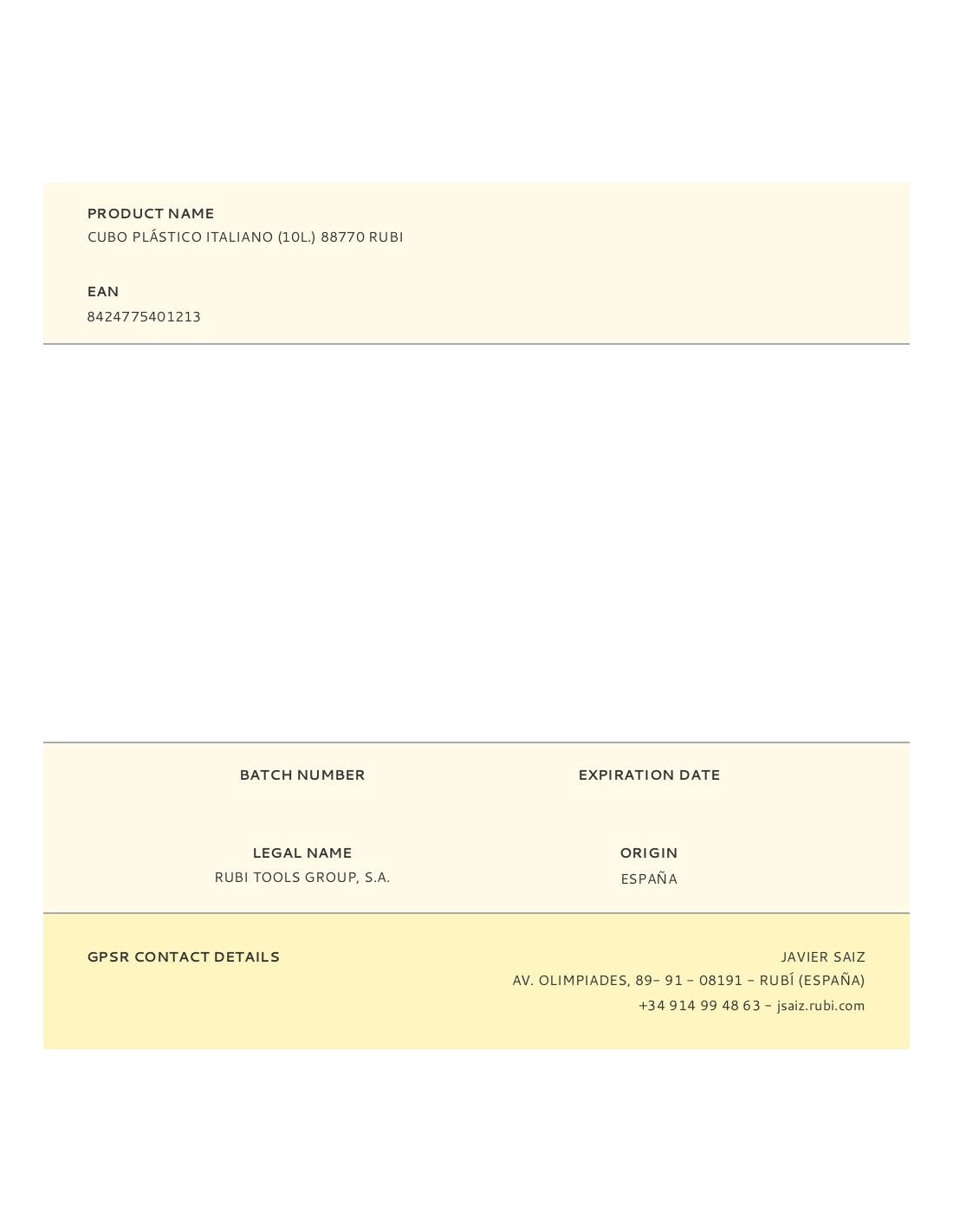 Cubo plástico italiano (10l.) 88770 rubi. para transporte de líquidos y morteros, aunque, gracias a su gran resistencia a la abrasión y al impacto por deformación, son muy útiles para la gestión de escombros en obra o reformas. capacidad máxima de 10l. el asa metálica de gran resistencia es de acero galvanizado, para reducir los daños por oxidación. pared de gran espesor y costillas verticales de refuerzo, distribuidas en todo su perímetro.