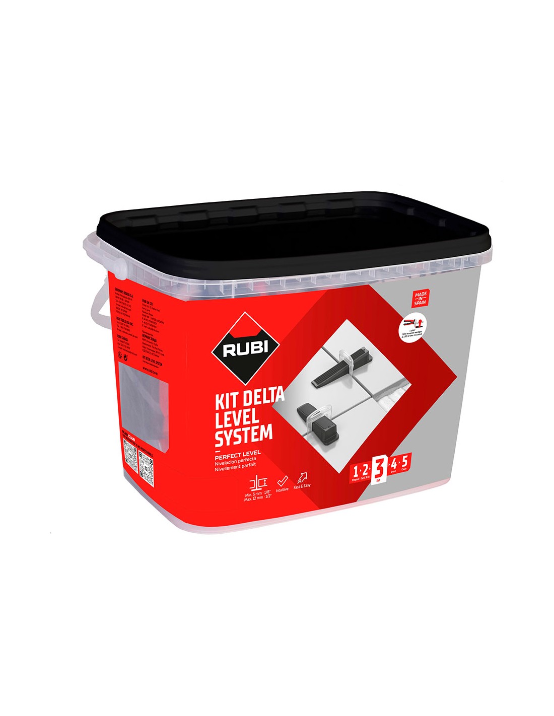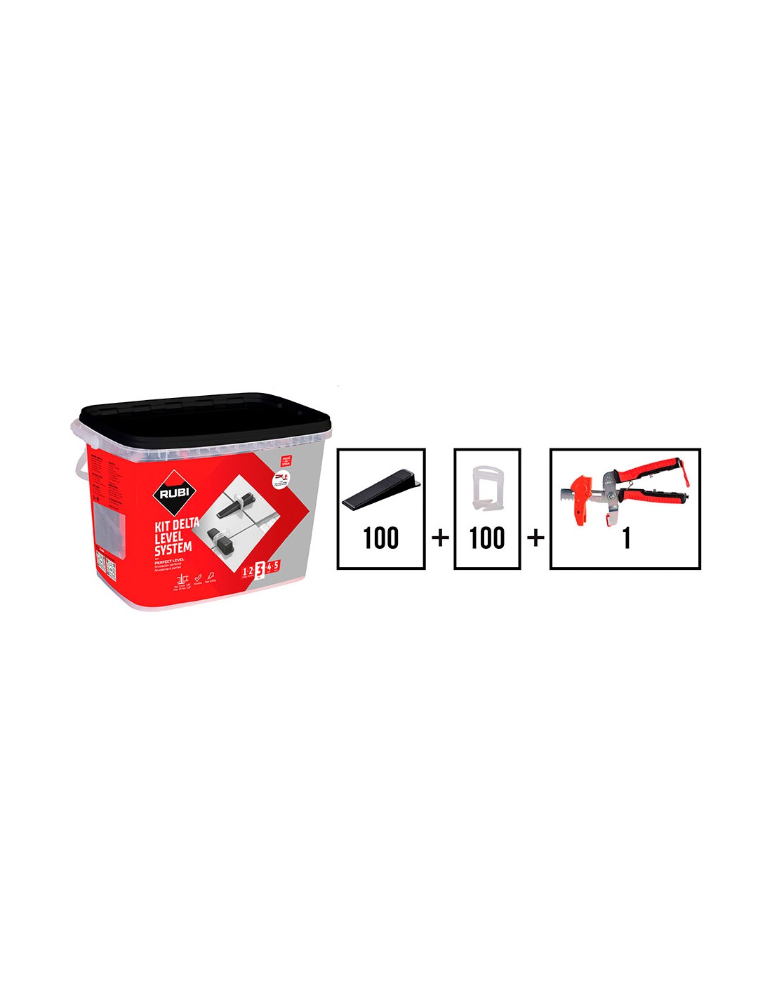 Kit delta level system 1mm (3-12mm) se compone de: 1 tenaza delta ls, utilizable tanto en pavimentos como en revestimientos (colocación de baldosa cerámica horizontal y vertical) 1 bolsa de 100 unidades de bridas delta ls, para su uso en baldosas cerámicas de espesores comprendidos entre los 3mm y los 12mm, y 1 bolsa de 100 unidades de cuñas delta ls reutilizables. servida en un práctico envase tipo cubo con asa, para facilitar su utilización y transporte.