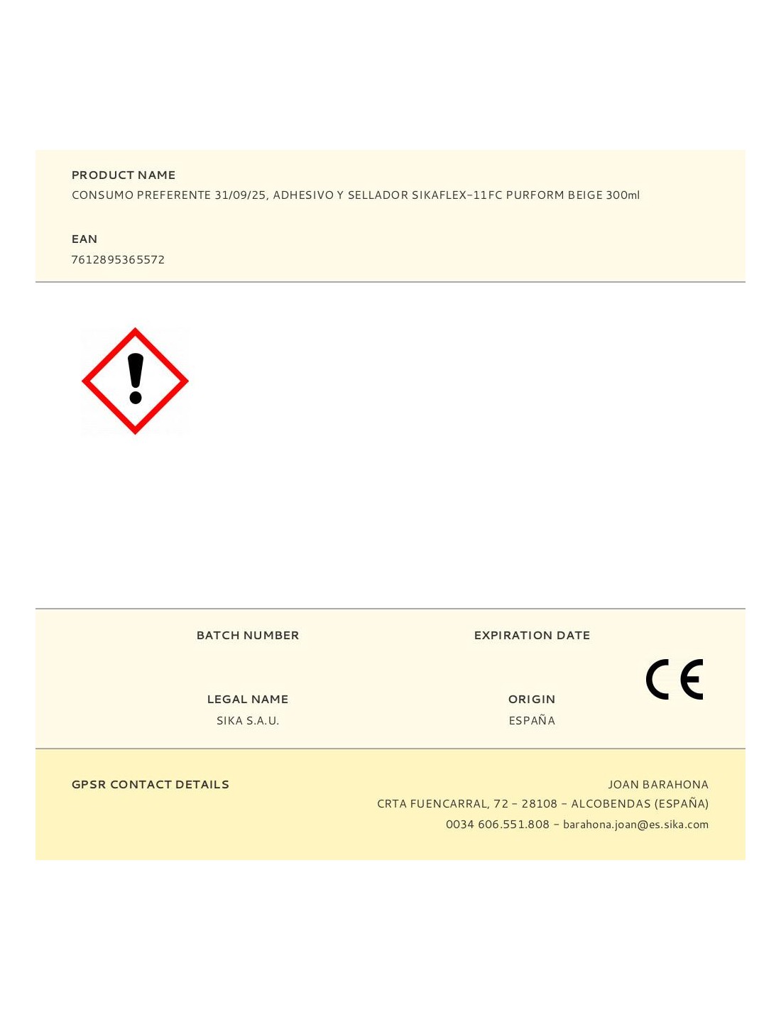 Adhesivo y sellador sikaflex-11fc purform, color beig masilla monocomponente a base de poliuretano, de elasticidad permanente, curado por humedad. se utiliza como sellador de juntas tanto verticales como como horizontales, como amortiguador acústico entre hormigón y perforaciones de tuberías y como adhesivo multiusos. adecuado para aplicaciones tanto en interior como en exterior. cartucho de 300ml