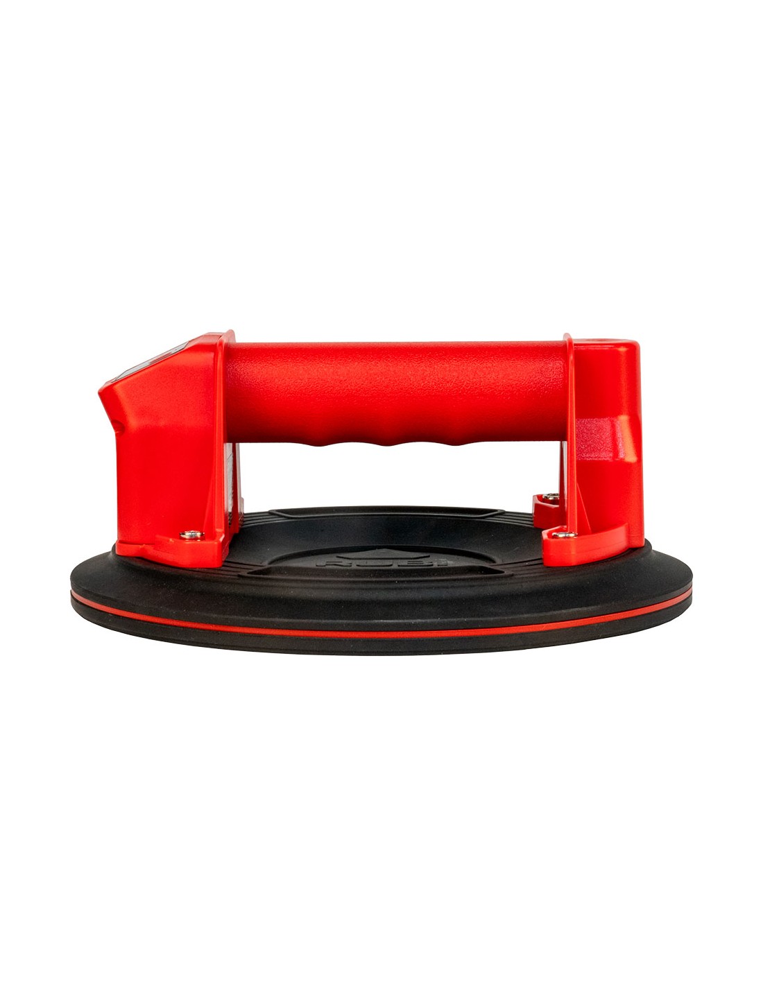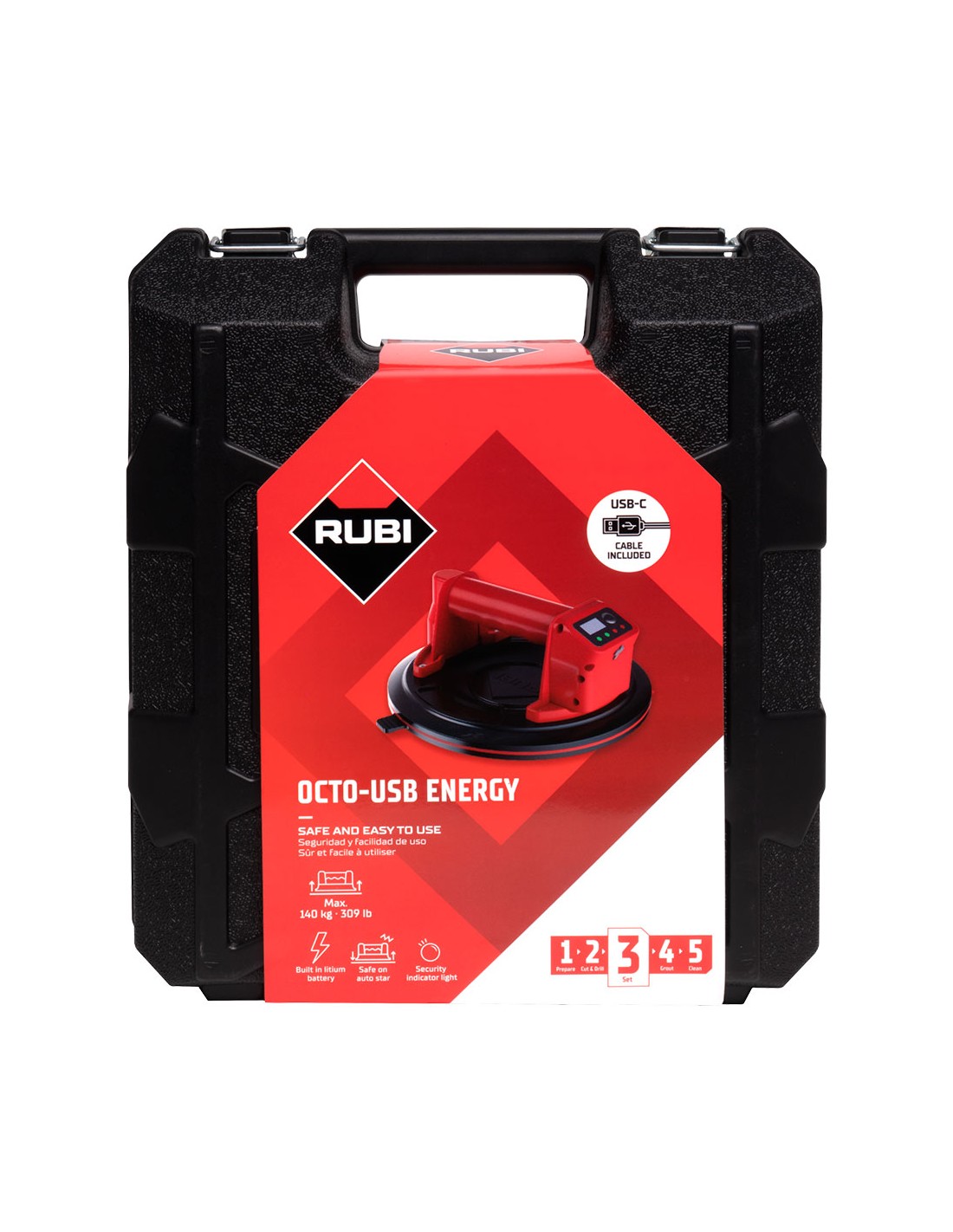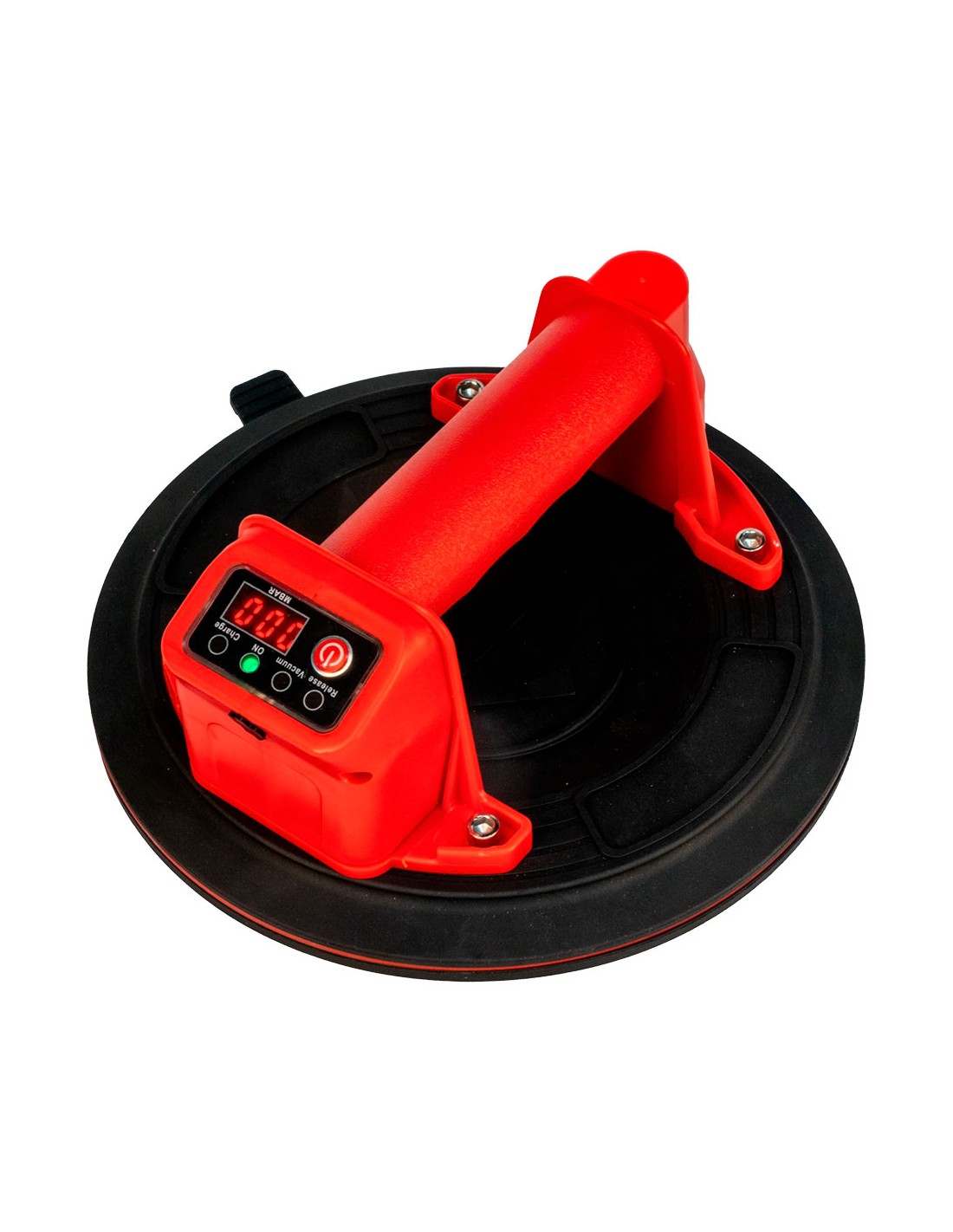Ventosa a batería diseñada para la manipulación de baldosas cerámicas. batería de 3.7 v / 2 ah integrada en la ventosa y carga a través de cable usb-c. botones a prueba de agua y polvo. pantalla digital con 4 indicadores: vacío / liberación / encendido / carga + pantalla de información de presión mbar. capacidad máxima de carga de 140 kg para superficies planas y lisas y manejo horizontal. estuche de plástico para transporte y protección