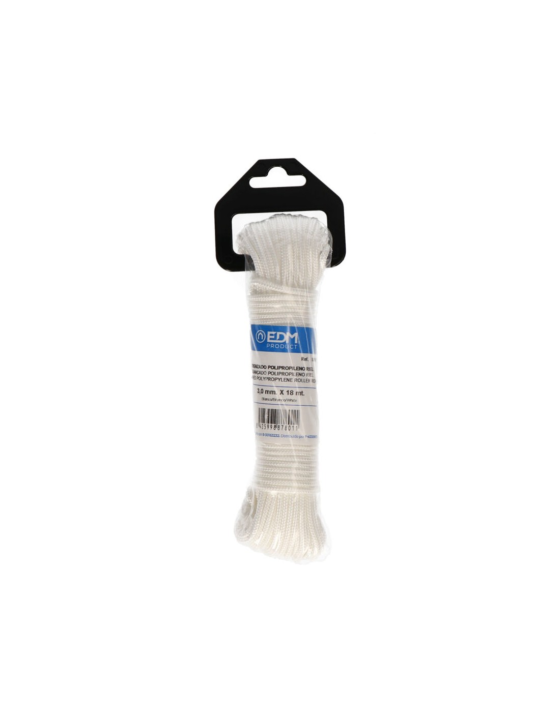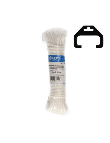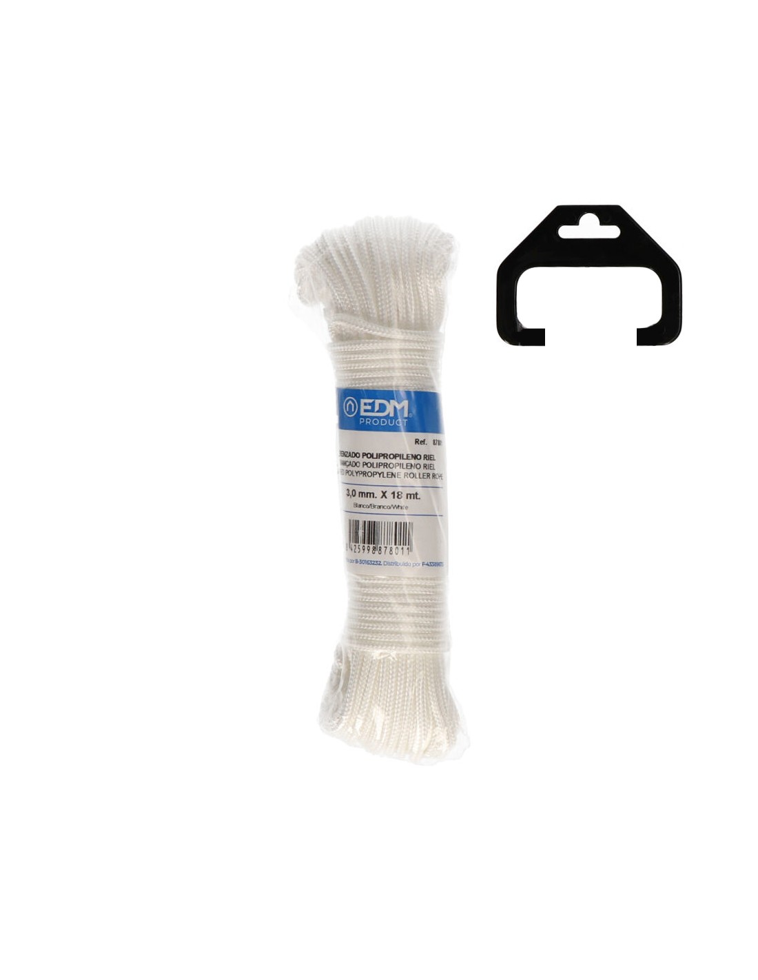Cordón trenzada polipropileno riel r.81 18m. composicion: trenzado exterior e interior de monofilamento de pp 100%. caracteristicas: flexible, suave, buena resistencia al roce. poca elasticidad. utilidades: cordon especial para rieles de cortinas y visillos. 125kg aprox. ø3mm color blanco