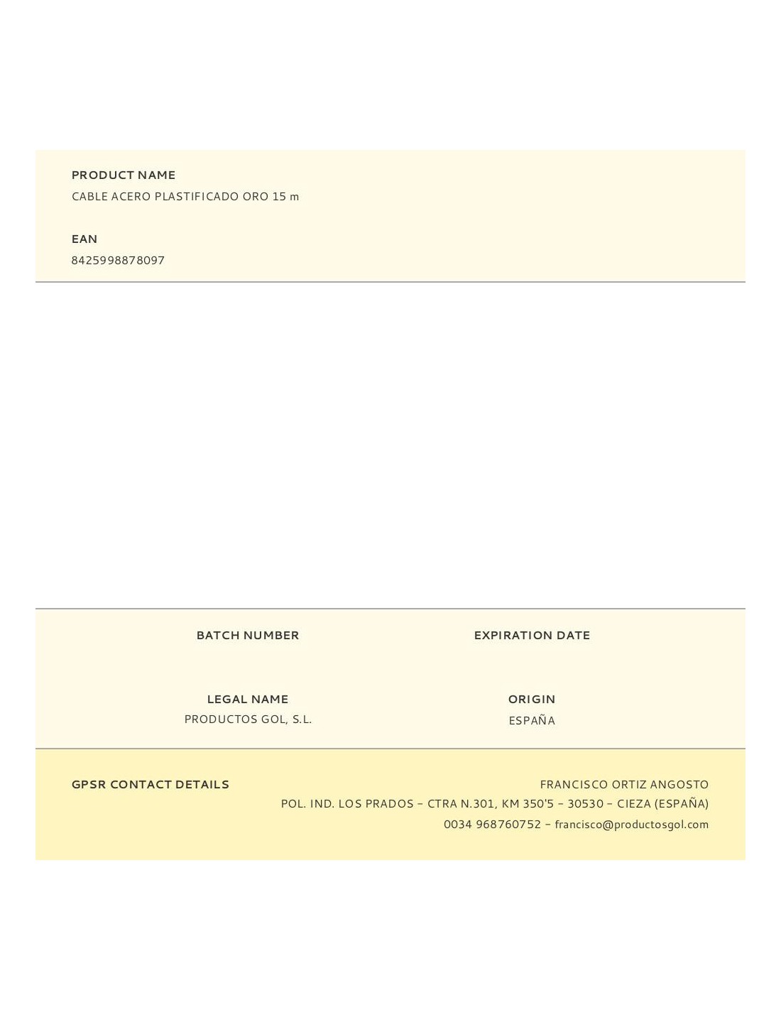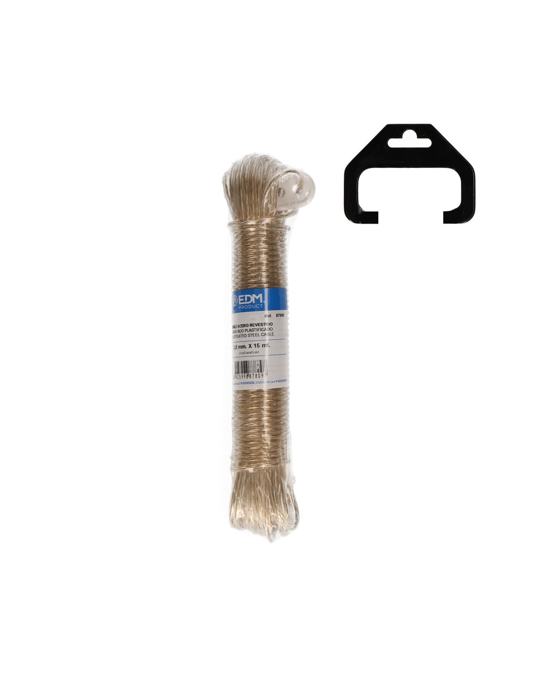 Cable acero plastificado 15 m oro. composicion: cable acero recubierto de pvc. caracteristicas: suave, buena resistencia. poca elasticidad. facil limpieza. utilidades: tendederos exteriores e interiores, camping, nautica, cercados, agricultura, industria en general, bricolaje