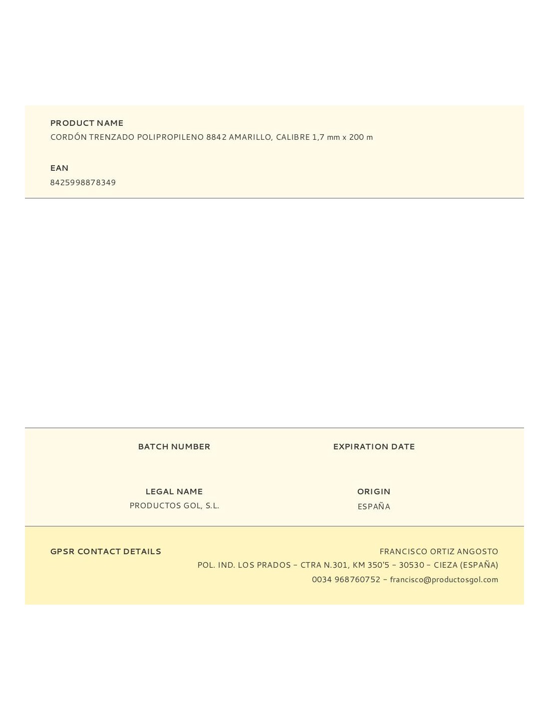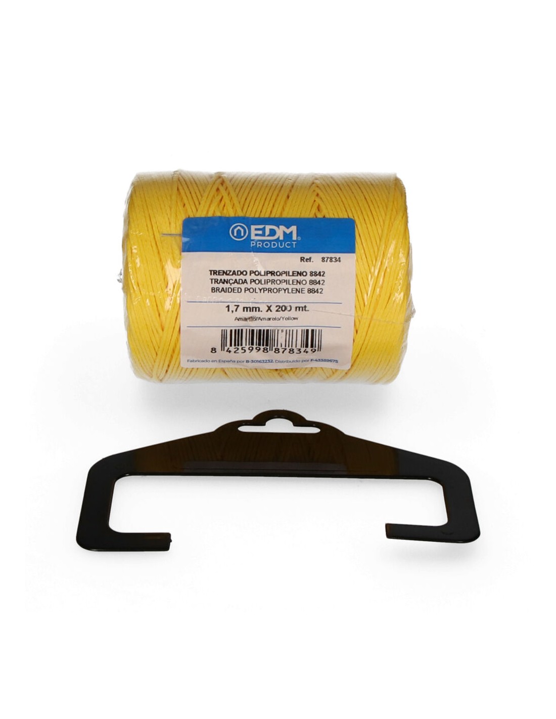 Cordón trenzada polipropileno 8842 200m amarillo ø1,7mm composicion: trenzado polipropileno alta tenacidad con proteccion solar. caracteristicas: suave, flexible, buena resistencia, posee flotabilidad. absorcion al agua 0%. utilidades: albañileria, agricultura, paqueteria. manualidades, bricolaje